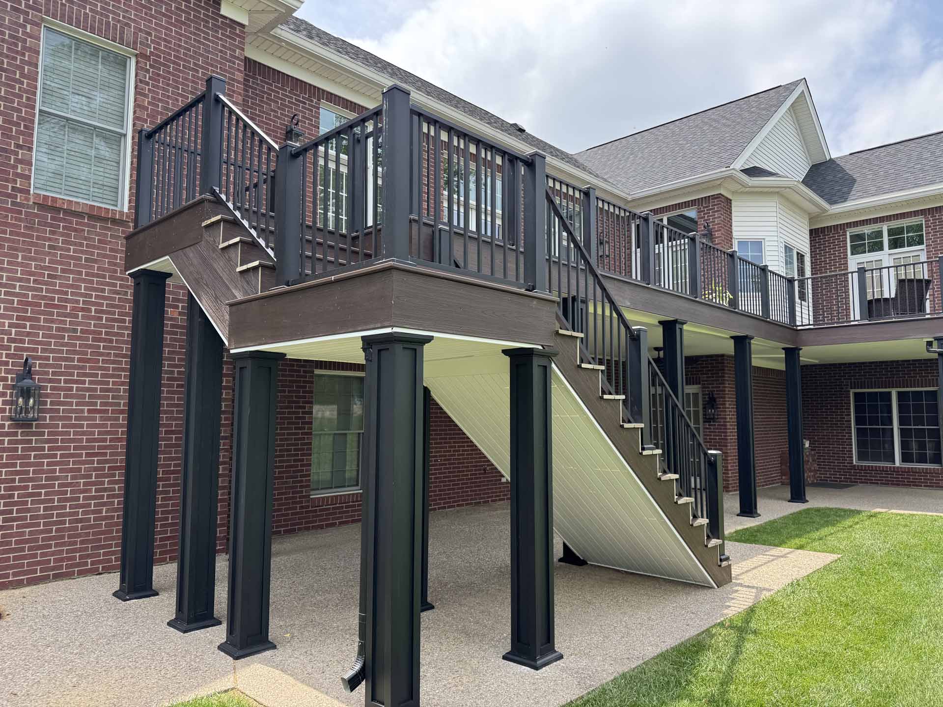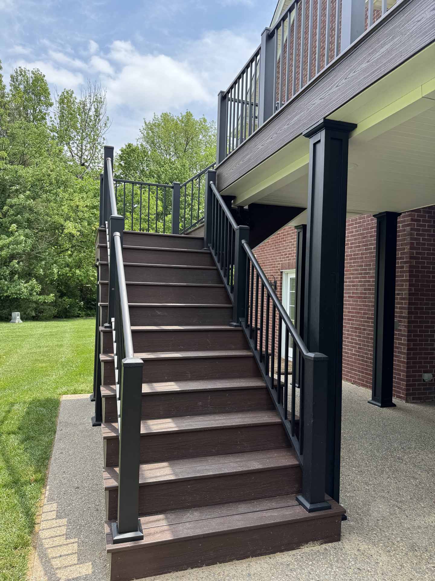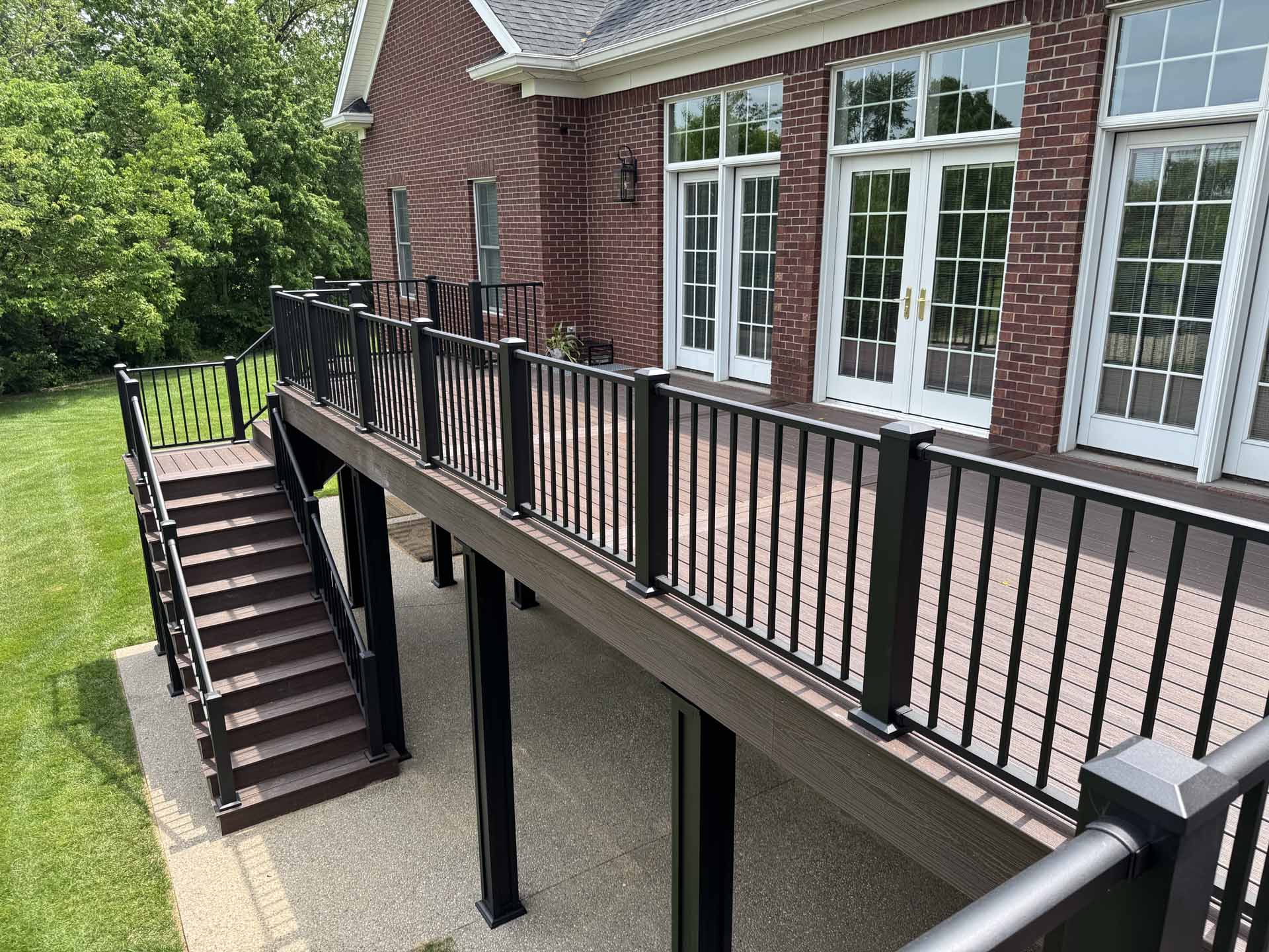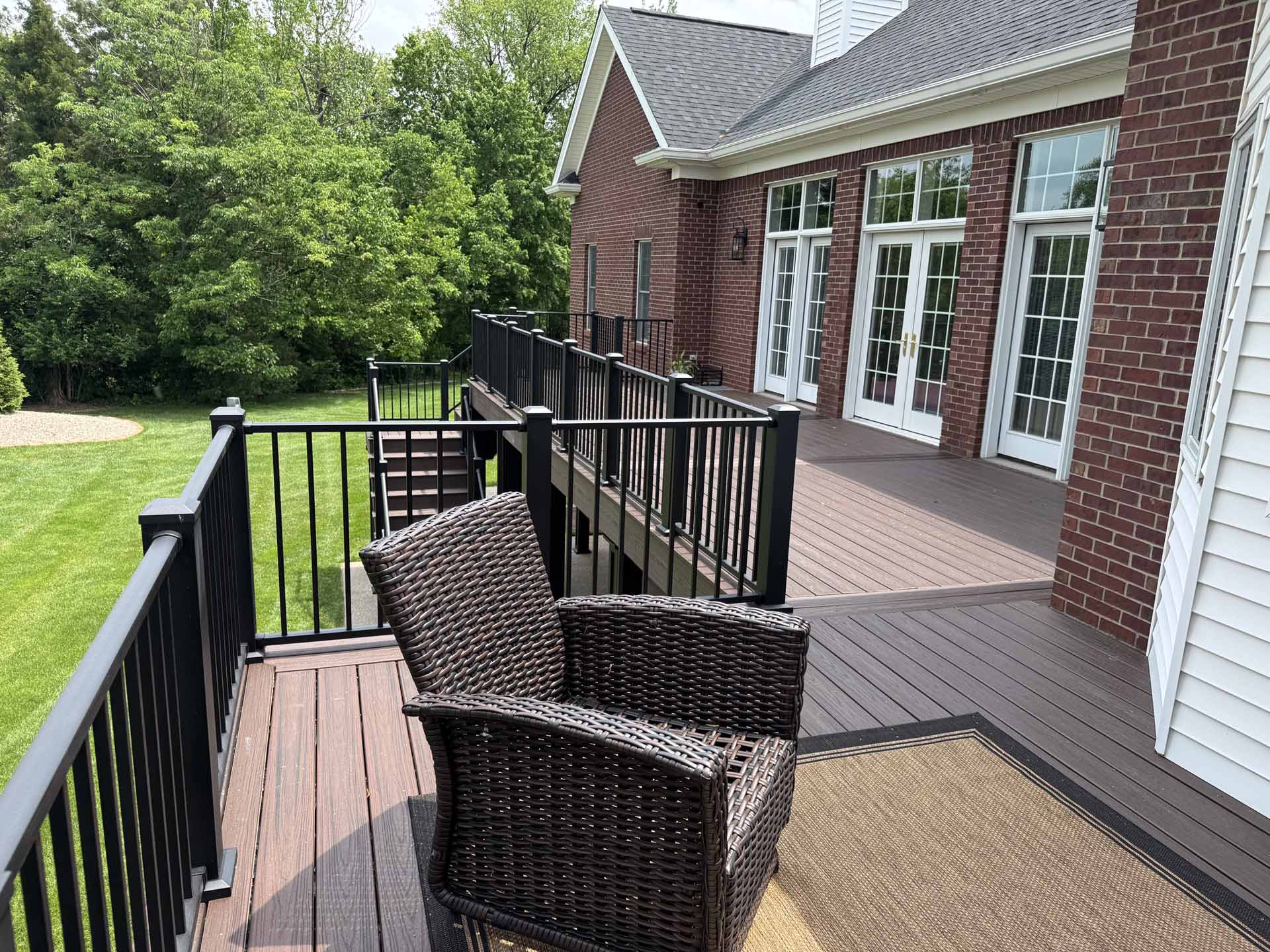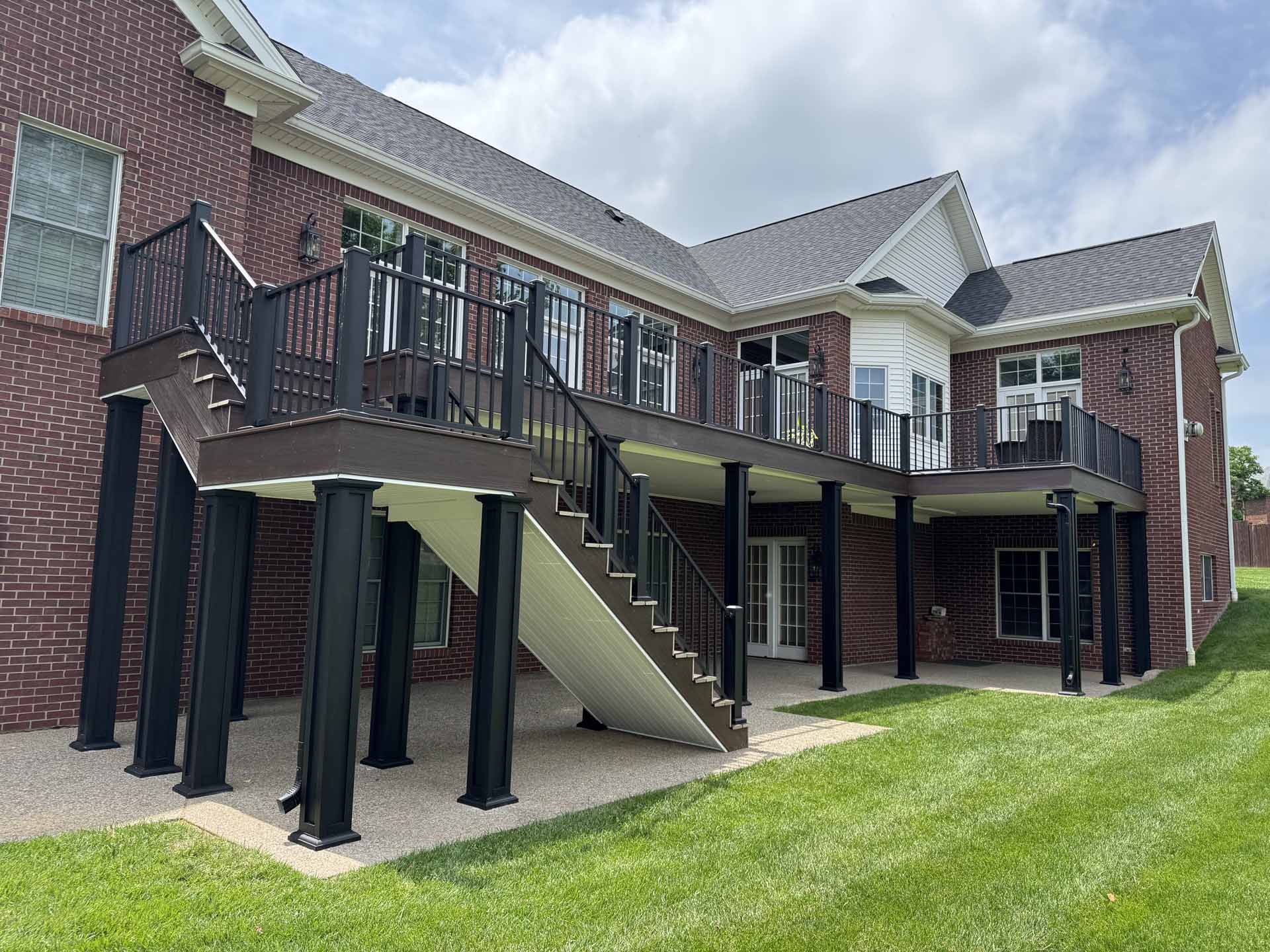 This spacious deck perfectly balances style and function, providing abundant space for entertaining or relaxing in this customer’s home in New Albany, Indiana. Built to last with Trex decking, it features decorative banding for added visual appeal and a Trex RainEscape system that keeps the lower-level patio dry. Newly designed stairs create a seamless flow between levels, combining practicality with refined style.