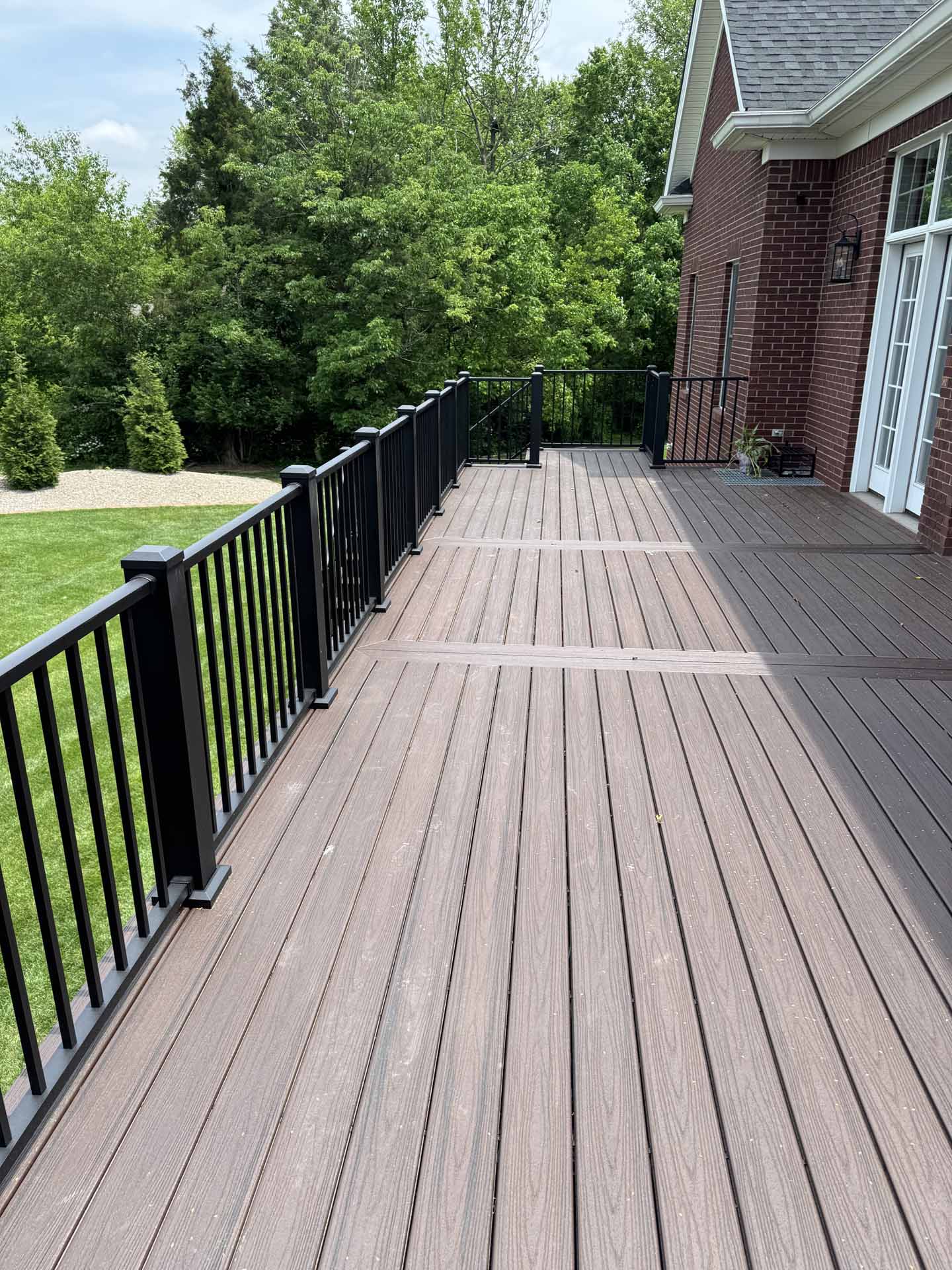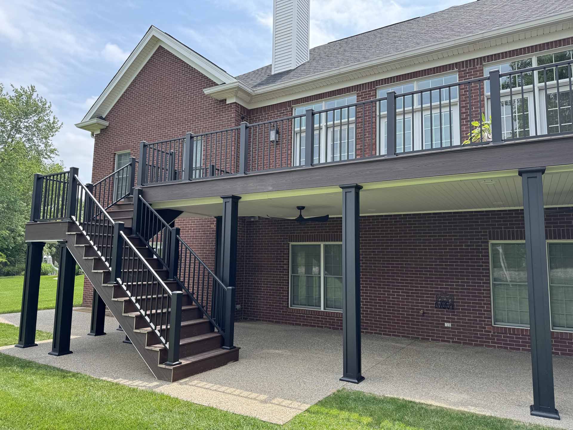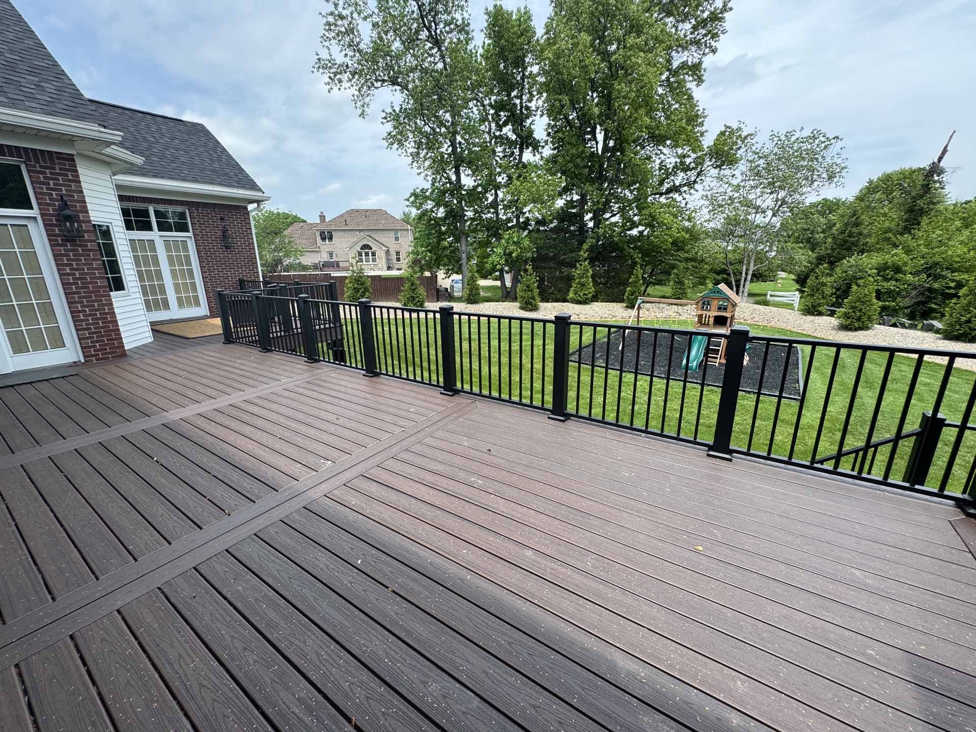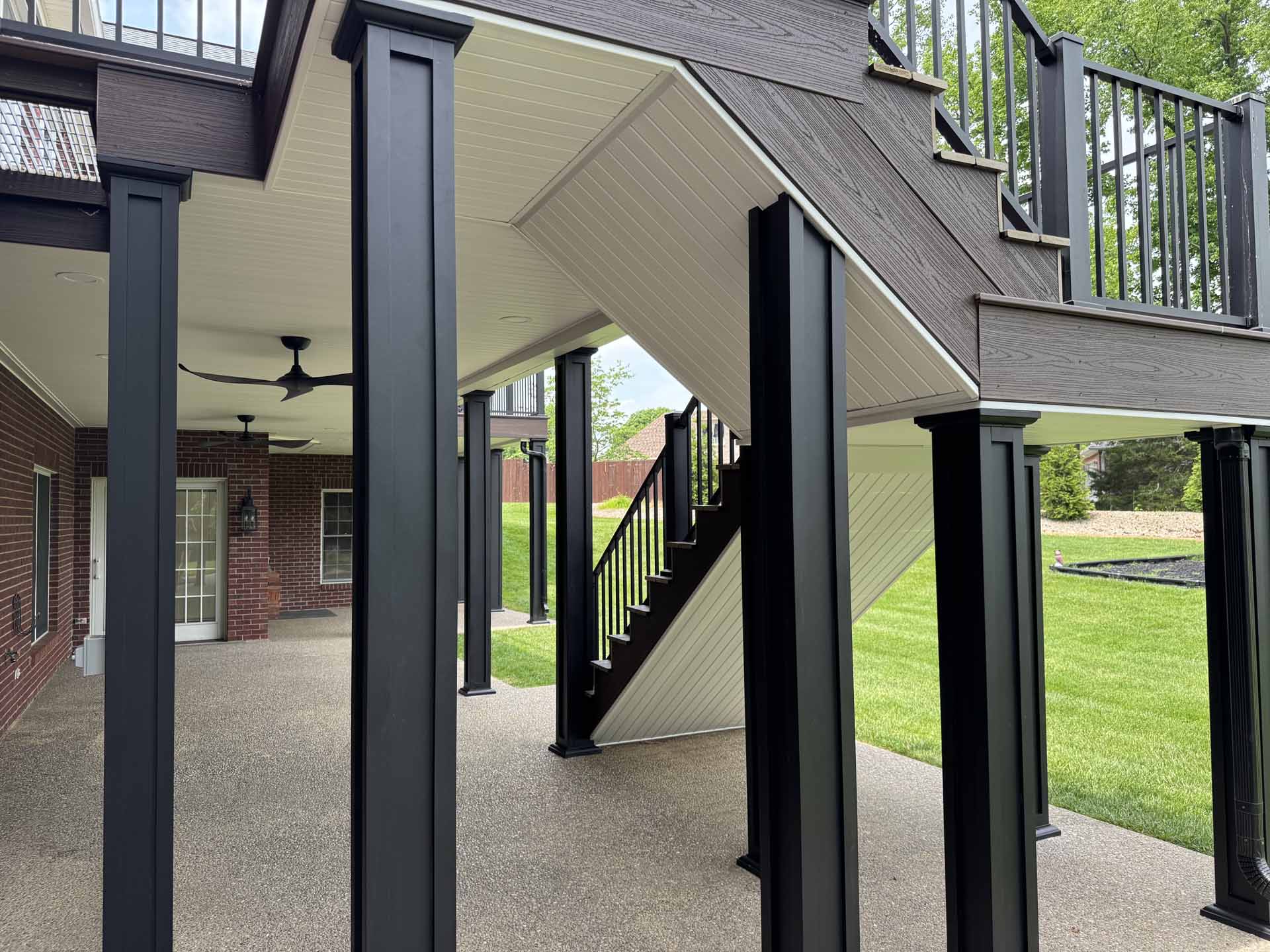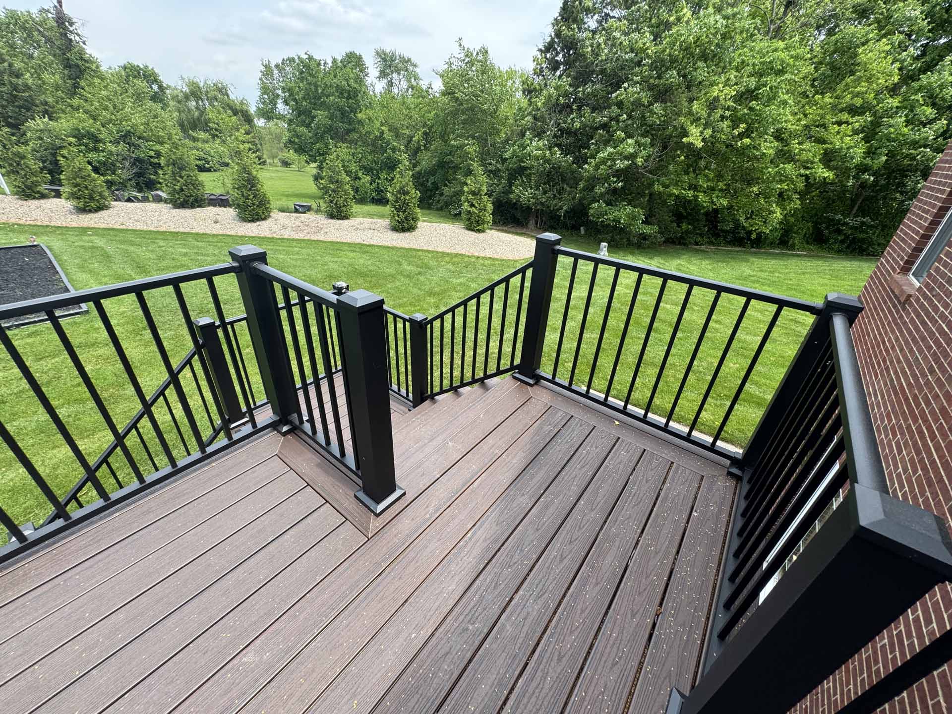 This spacious deck perfectly balances style and function, providing abundant space for entertaining or relaxing in this customer’s home in New Albany, Indiana. Built to last with Trex decking, it features decorative banding for added visual appeal and a Trex RainEscape system that keeps the lower-level patio dry. Newly designed stairs create a seamless flow between levels, combining practicality with refined style.