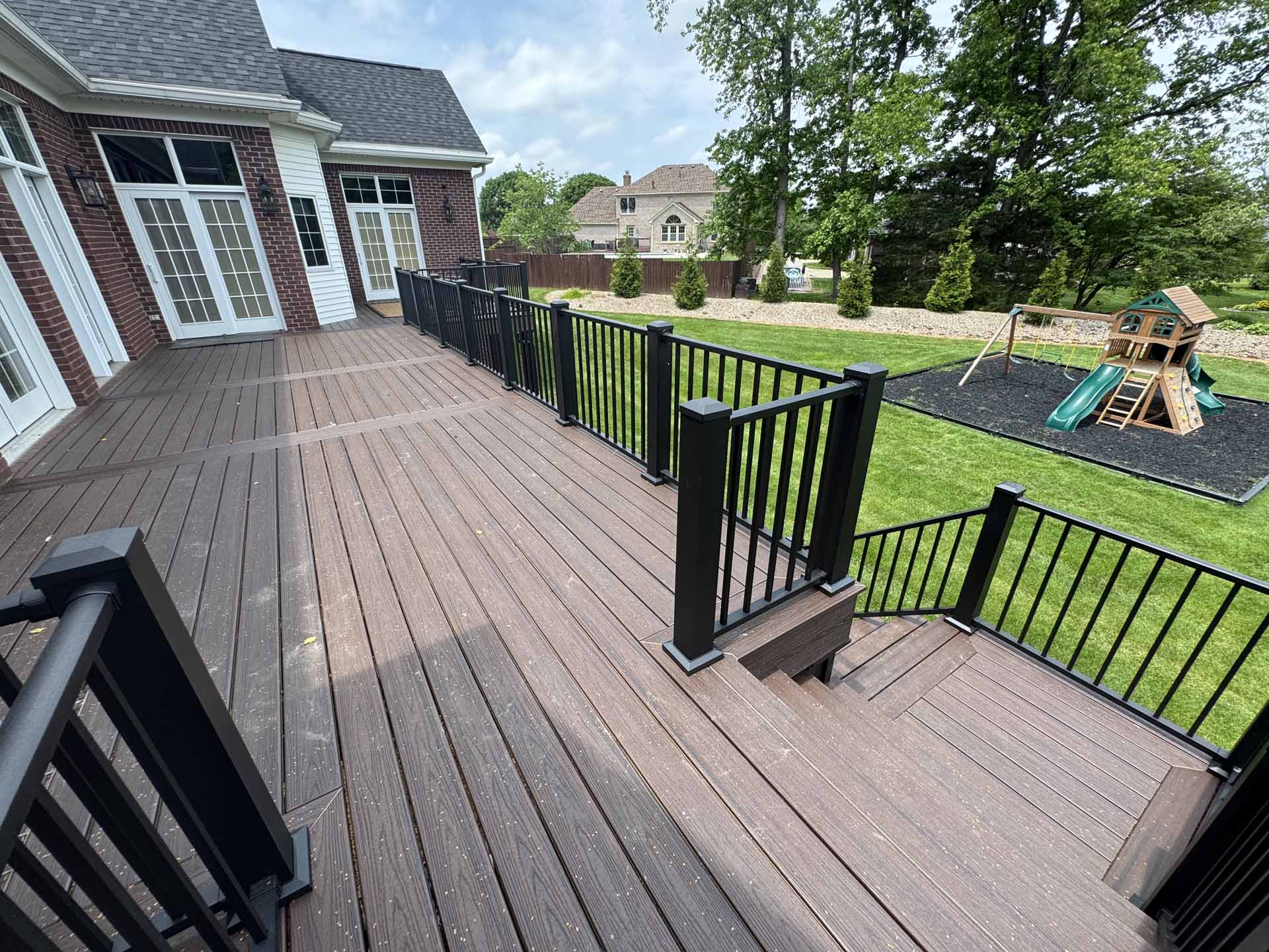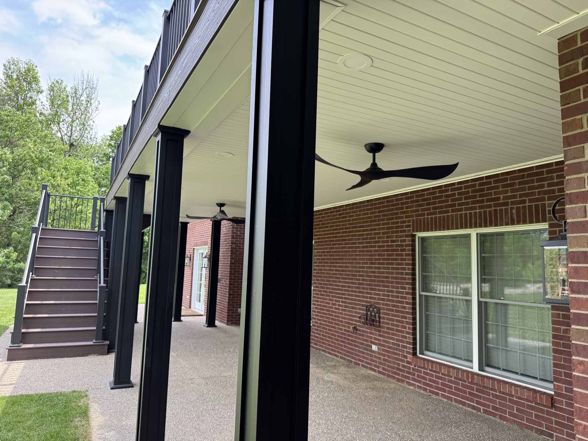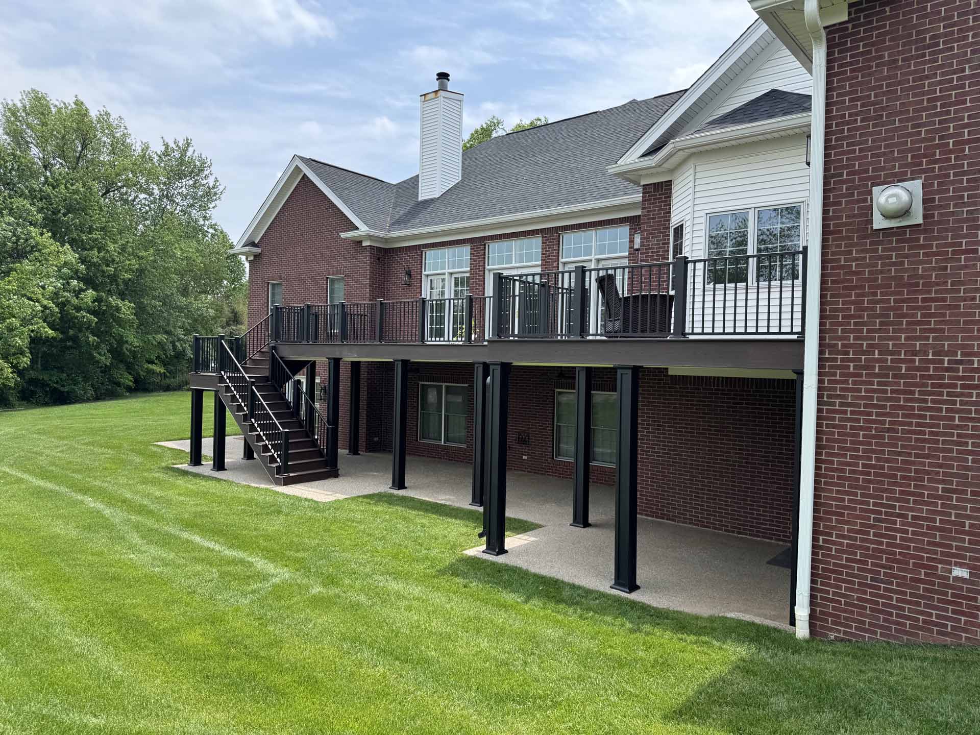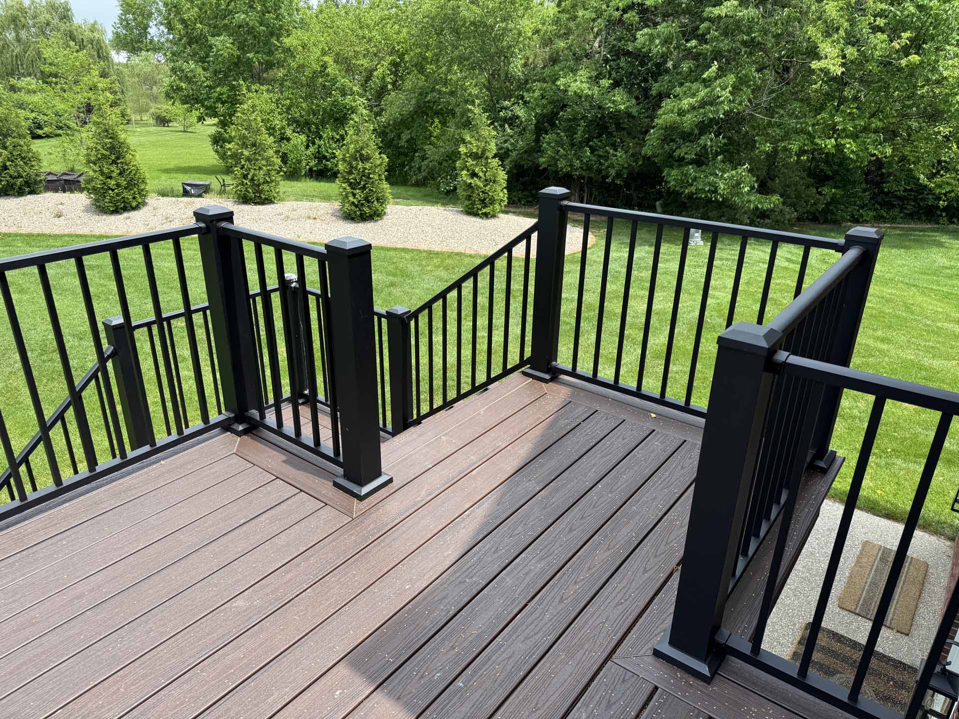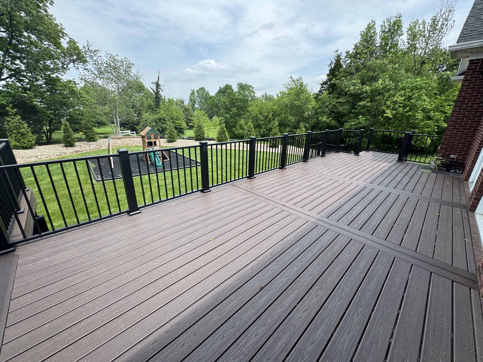 This spacious deck perfectly balances style and function, providing abundant space for entertaining or relaxing in this customer’s home in New Albany, Indiana. Built to last with Trex decking, it features decorative banding for added visual appeal and a Trex RainEscape system that keeps the lower-level patio dry. Newly designed stairs create a seamless flow between levels, combining practicality with refined style.