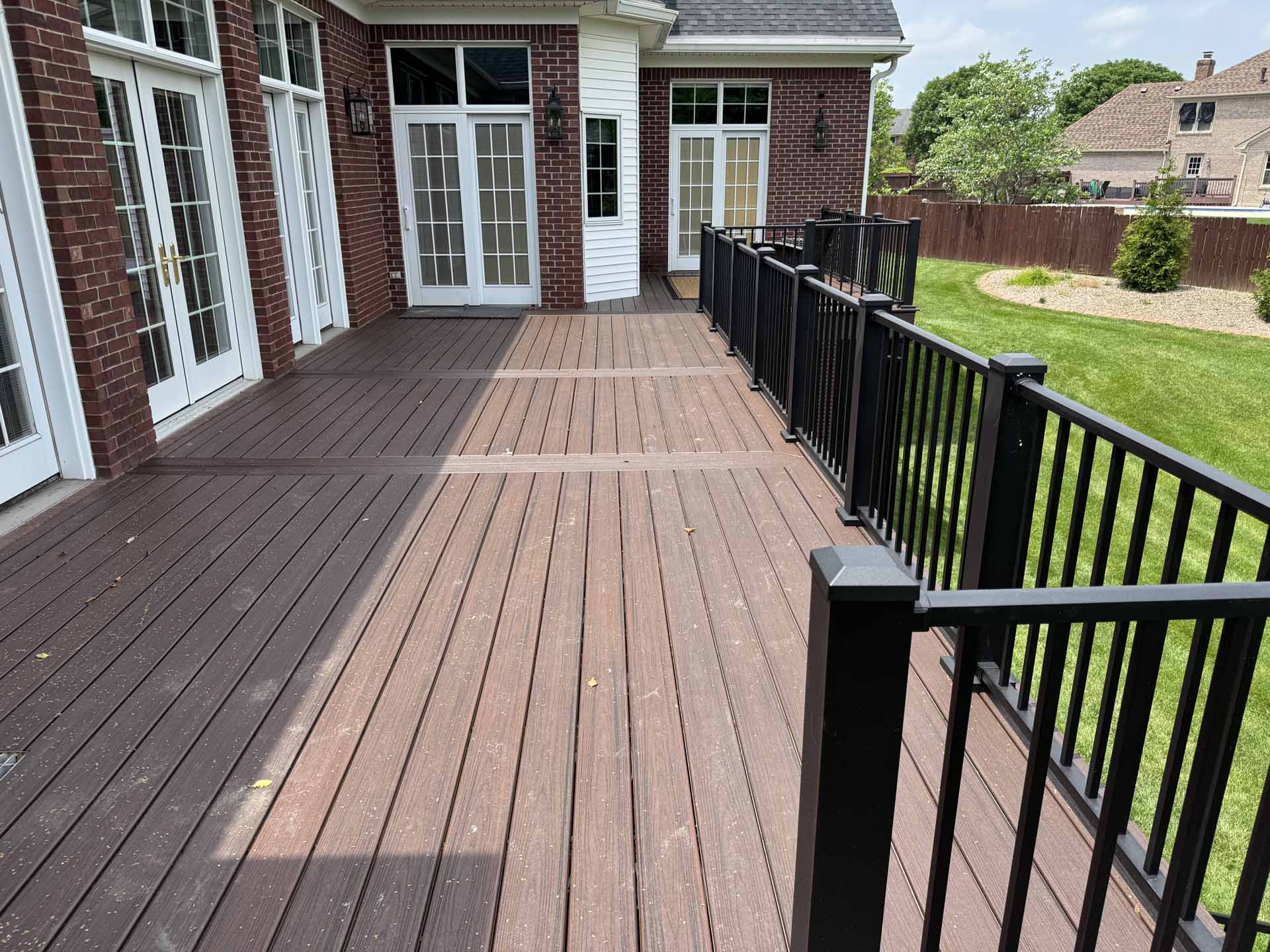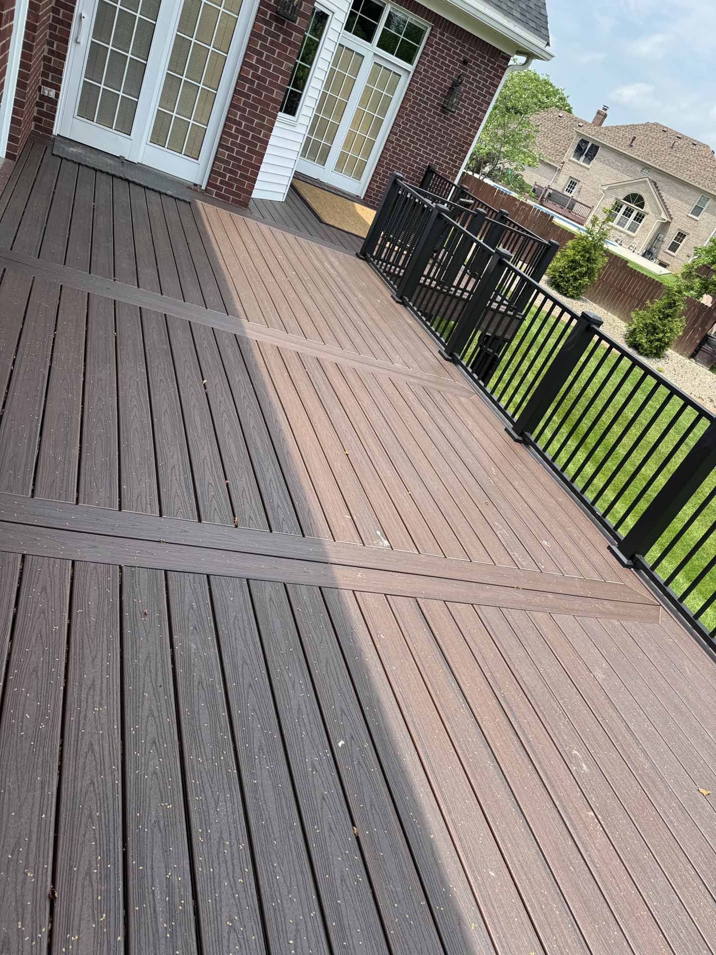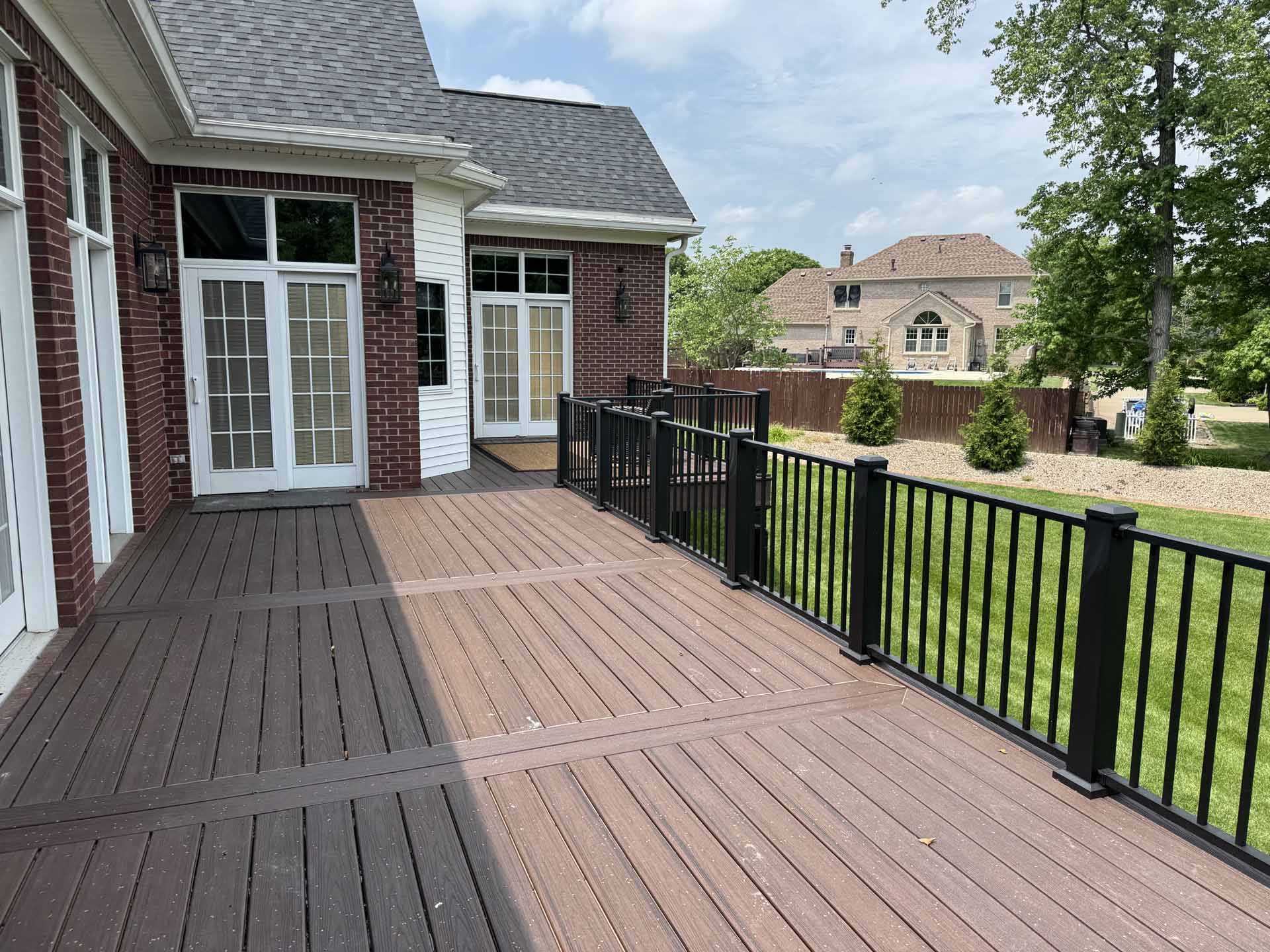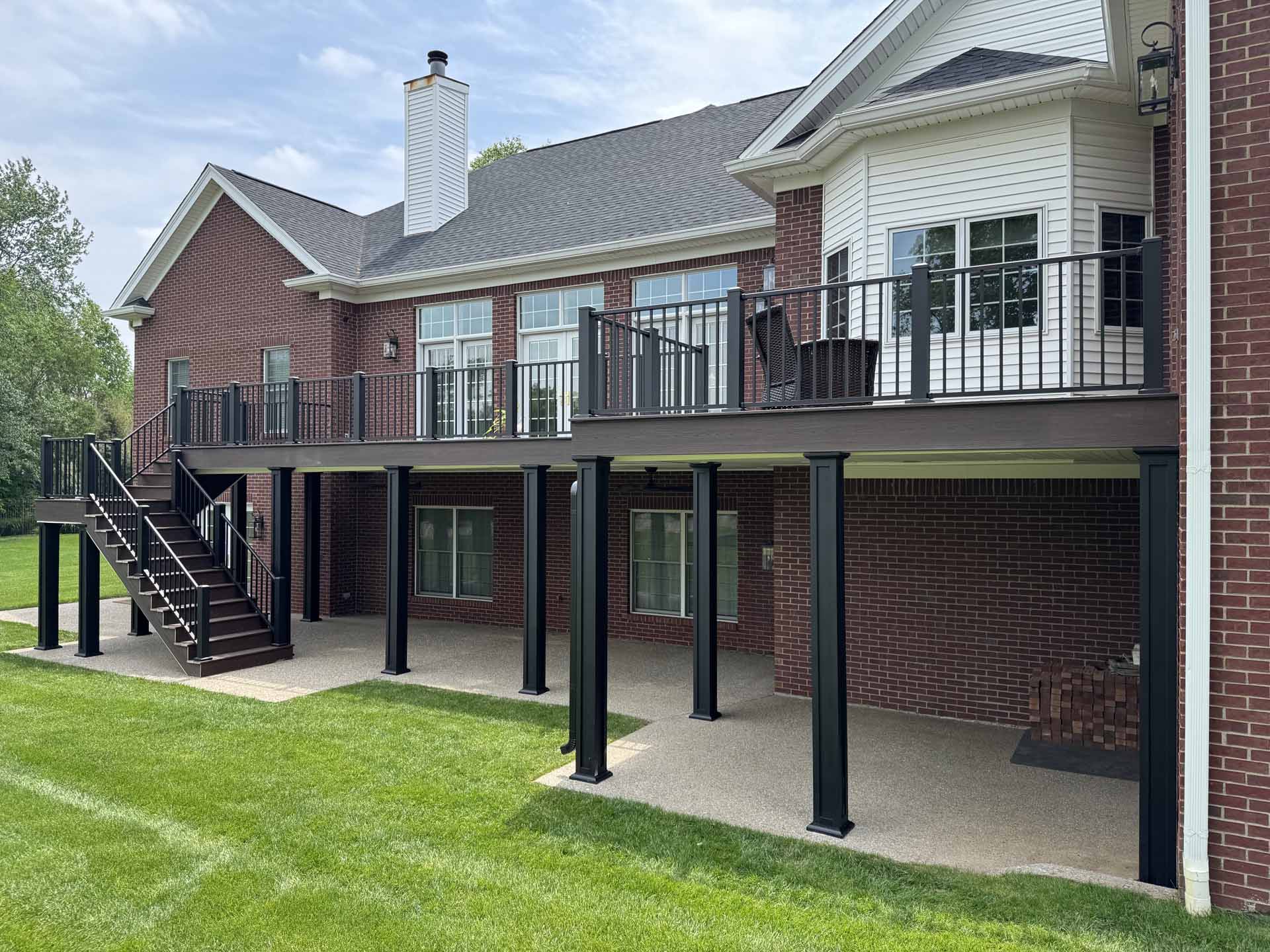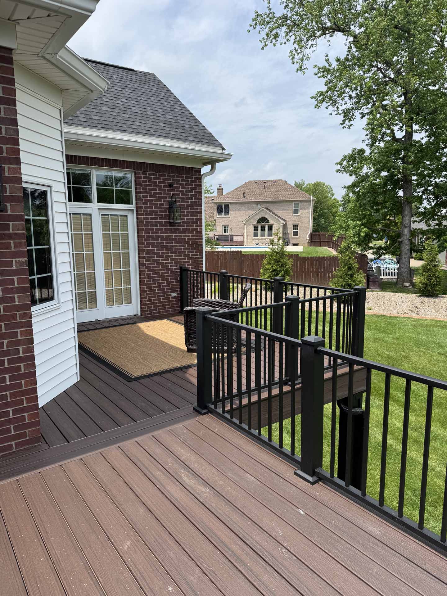 This spacious deck perfectly balances style and function, providing abundant space for entertaining or relaxing in this customer’s home in New Albany, Indiana. Built to last with Trex decking, it features decorative banding for added visual appeal and a Trex RainEscape system that keeps the lower-level patio dry. Newly designed stairs create a seamless flow between levels, combining practicality with refined style.