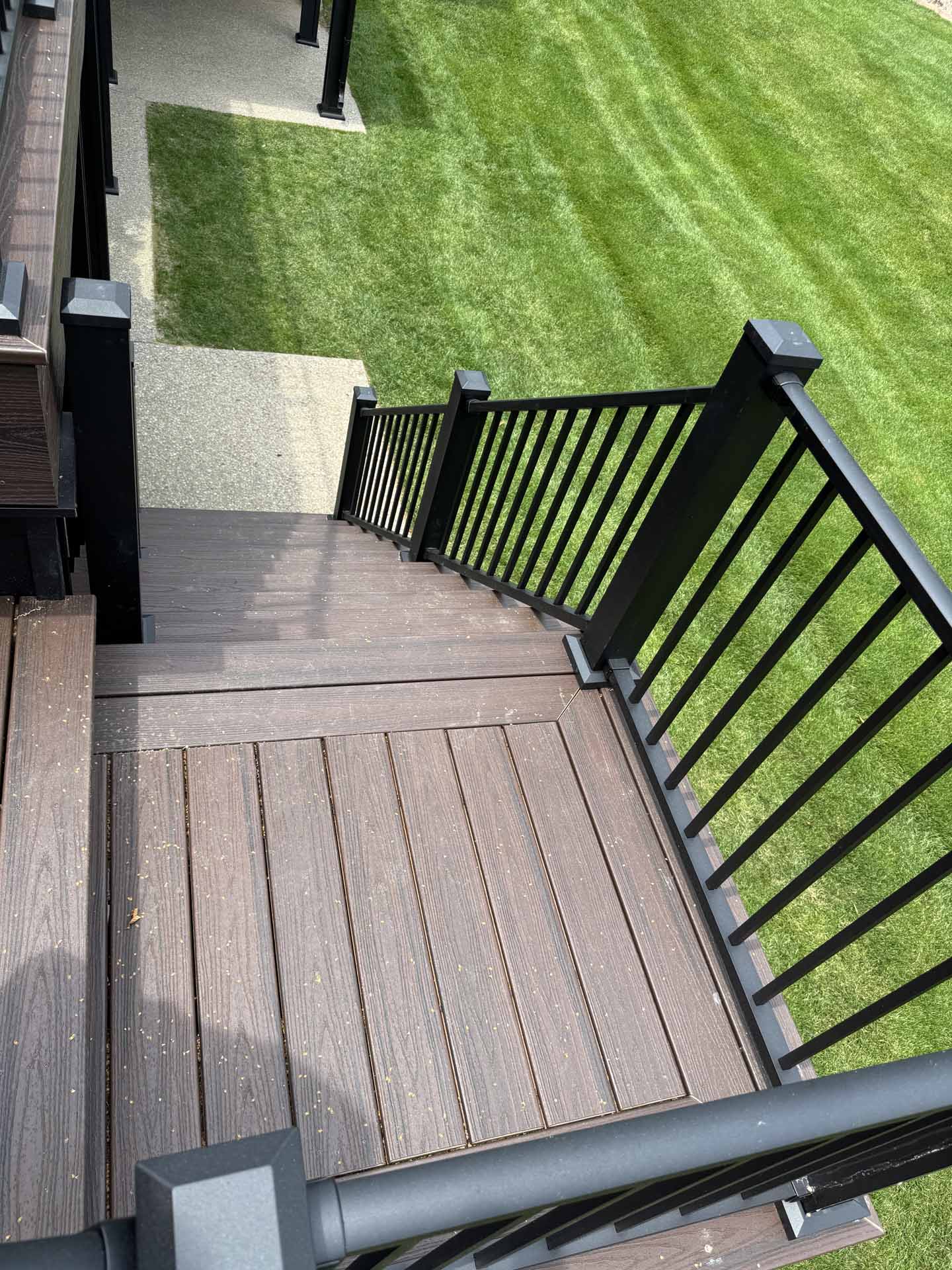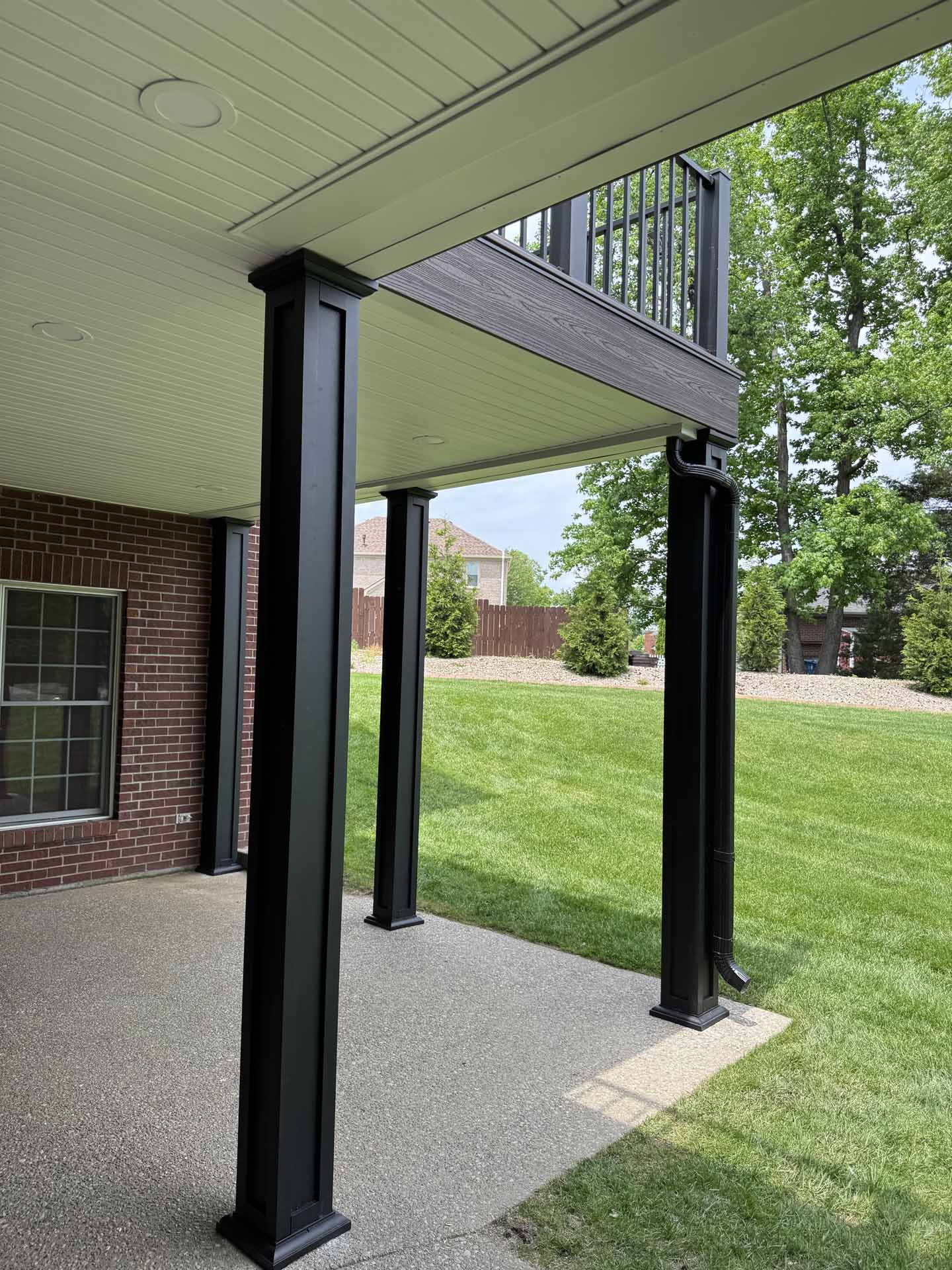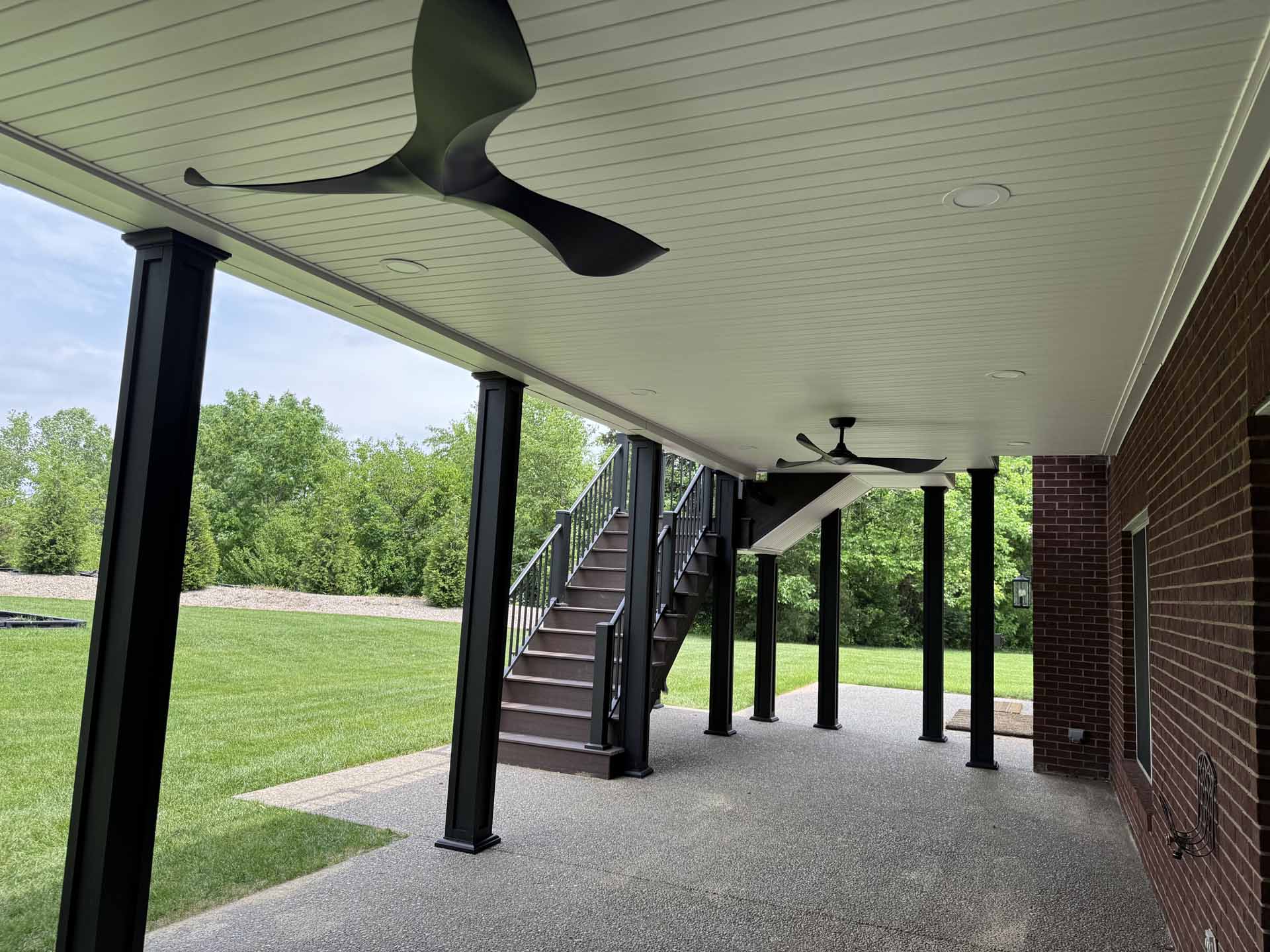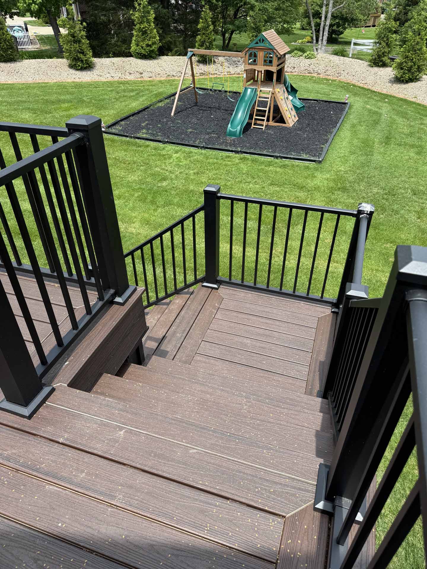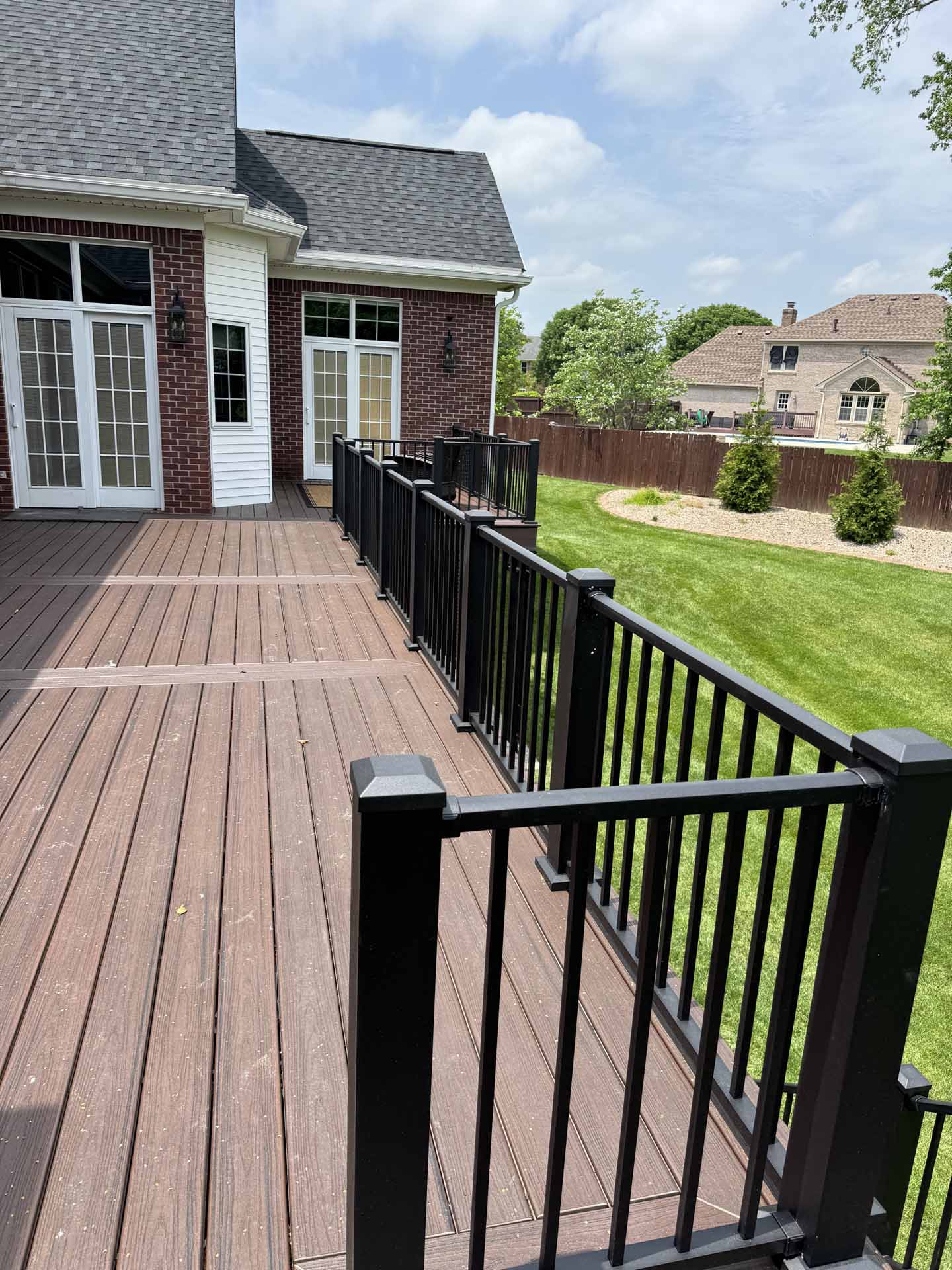 This spacious deck perfectly balances style and function, providing abundant space for entertaining or relaxing in this customer’s home in New Albany, Indiana. Built to last with Trex decking, it features decorative banding for added visual appeal and a Trex RainEscape system that keeps the lower-level patio dry. Newly designed stairs create a seamless flow between levels, combining practicality with refined style.