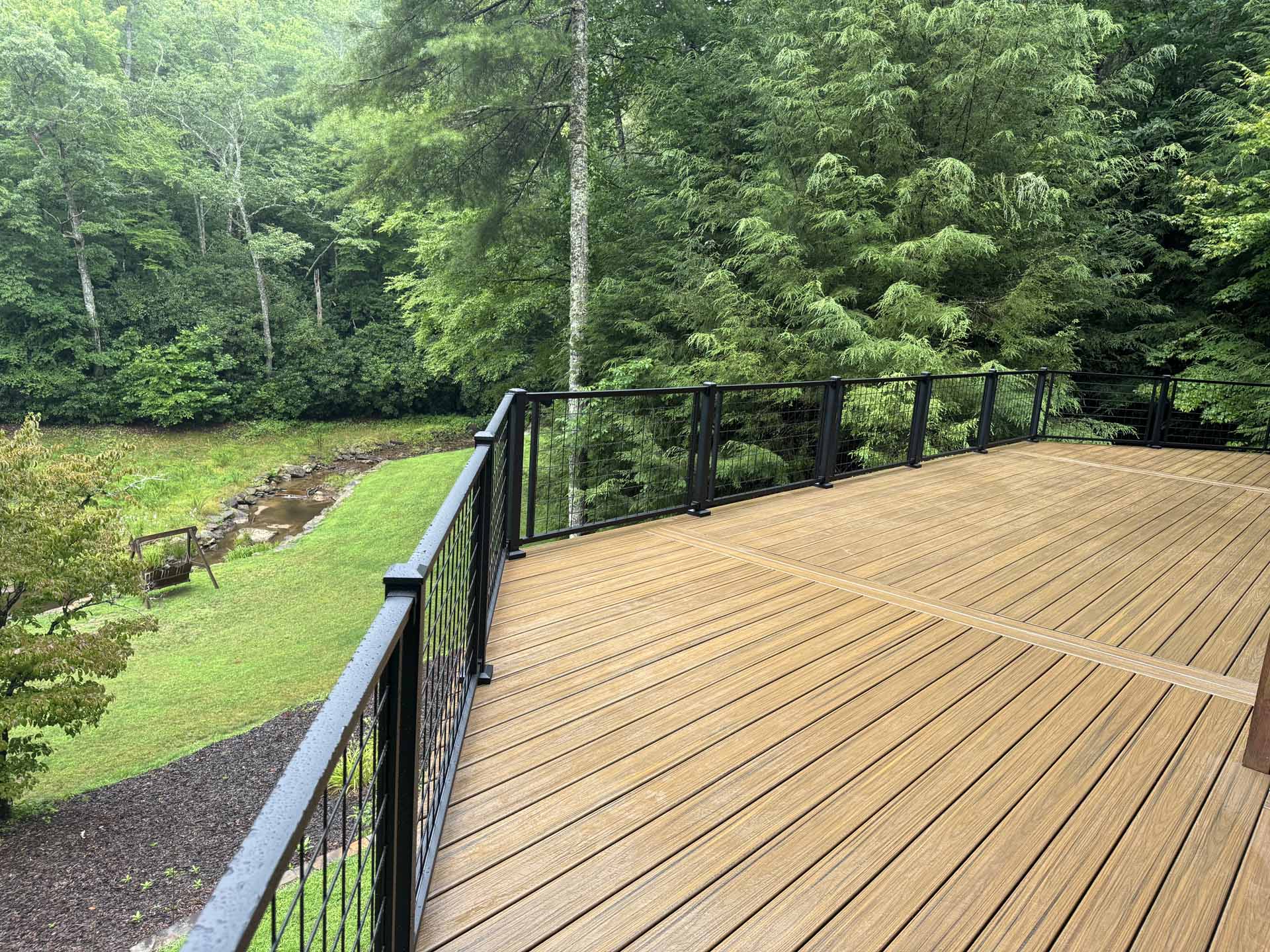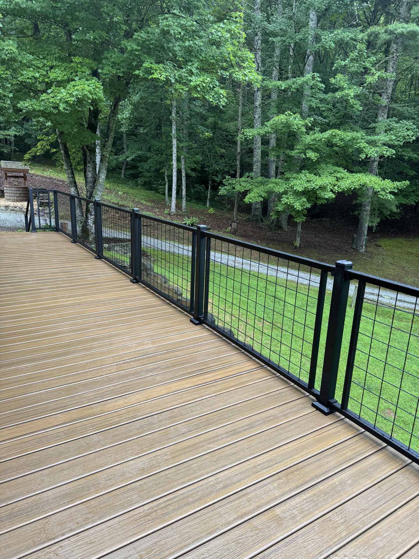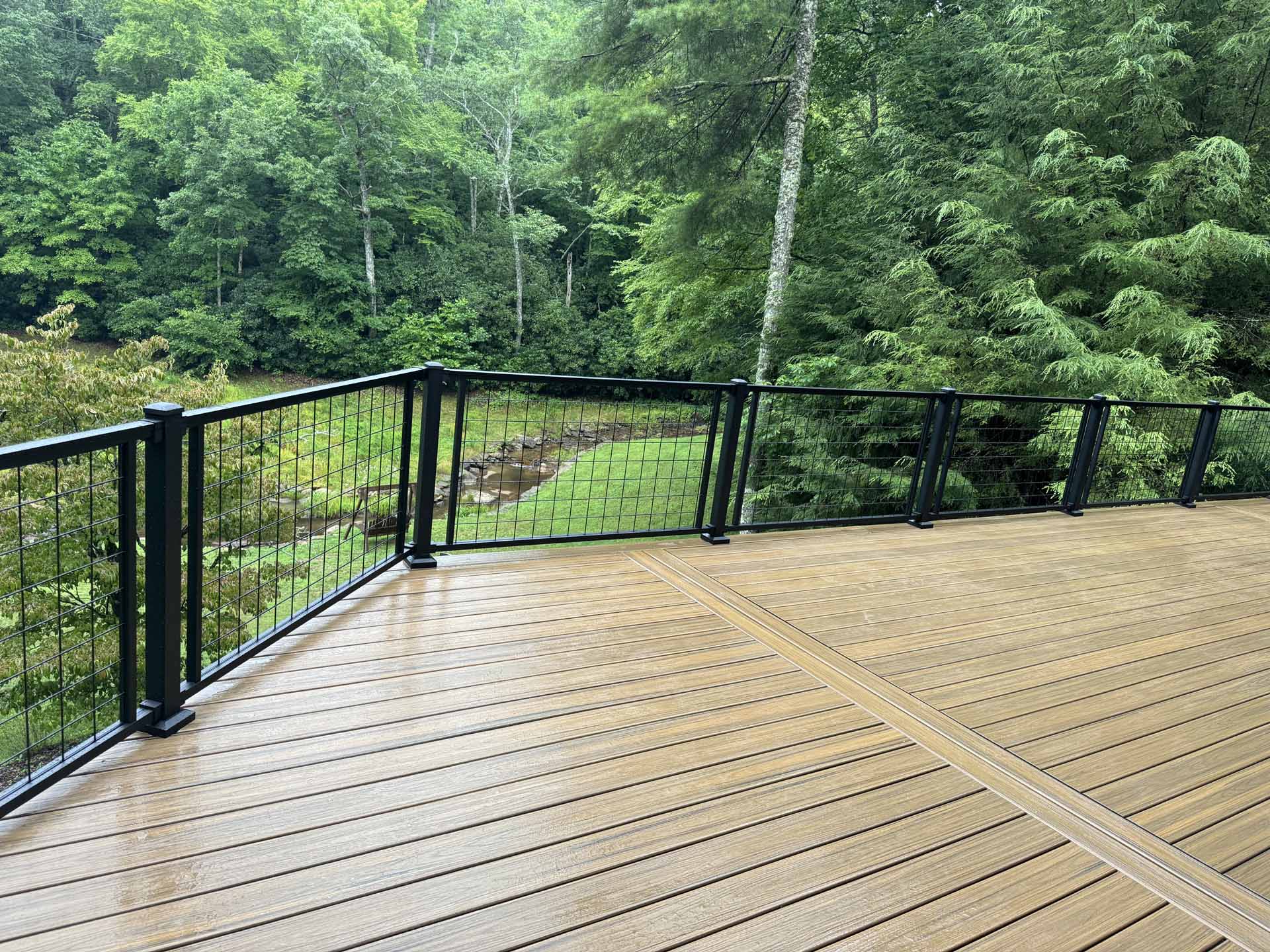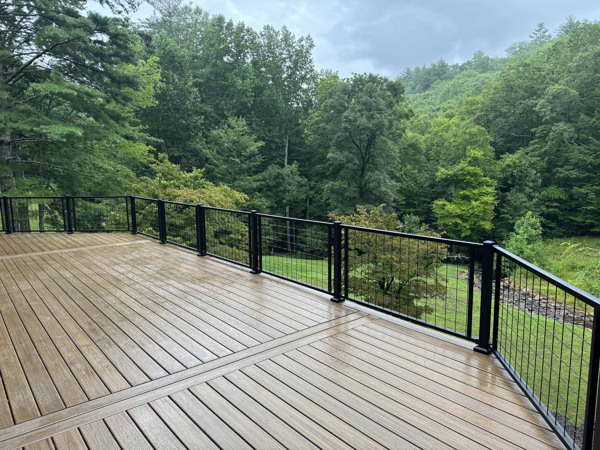 Perched in a serene mountain setting, this custom deck provides sweeping views of a mountain stream. Crafted with long-lasting Trex decking and a unique hogwire railing, it’s designed for both style and comfort—perfect for rocking chairs, quiet reflection, or entertaining in the outdoors.