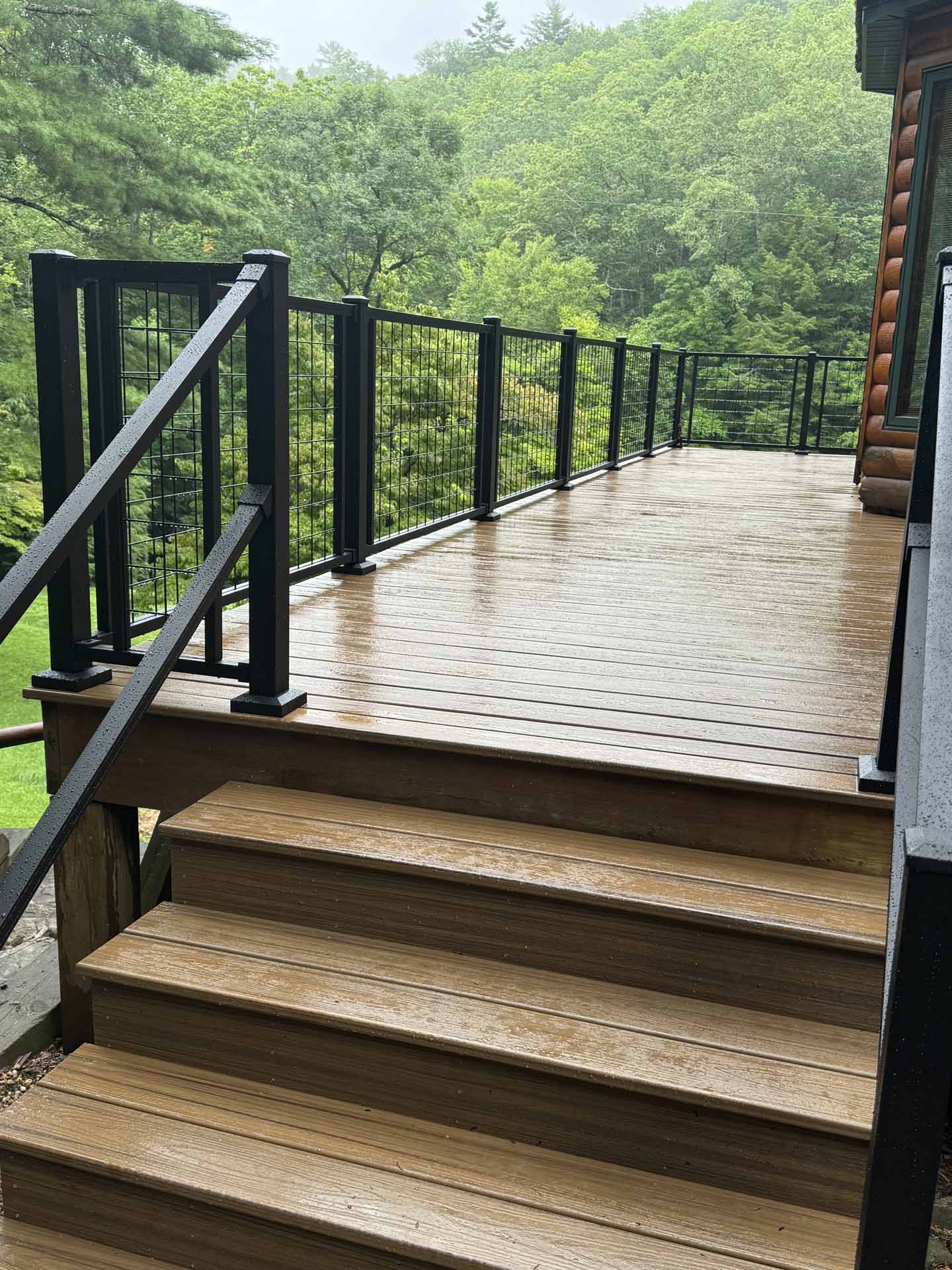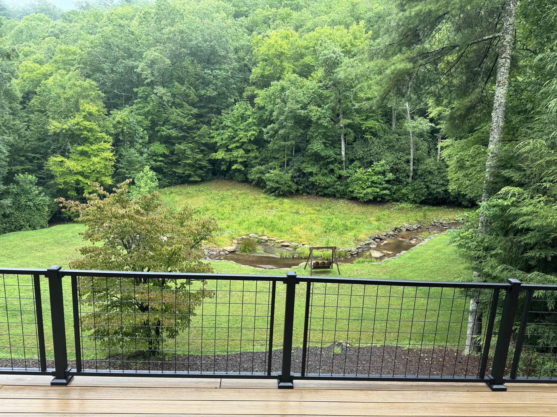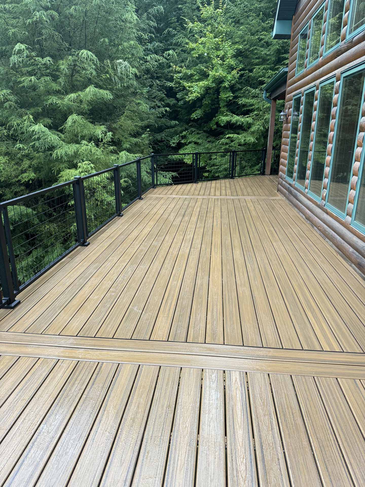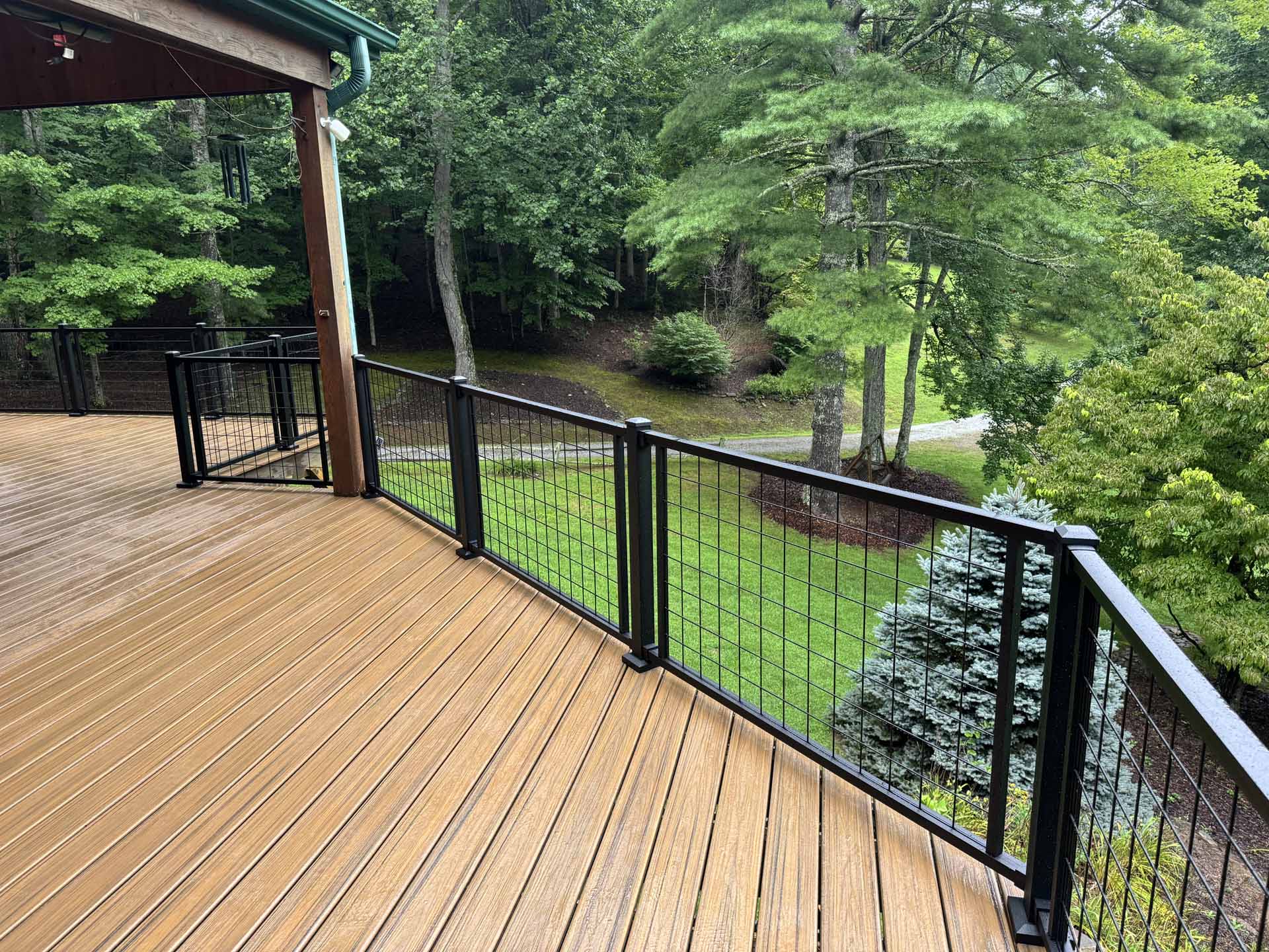 Perched in a serene mountain setting, this custom deck provides sweeping views of a mountain stream. Crafted with long-lasting Trex decking and a unique hogwire railing, it’s designed for both style and comfort—perfect for rocking chairs, quiet reflection, or entertaining in the outdoors.