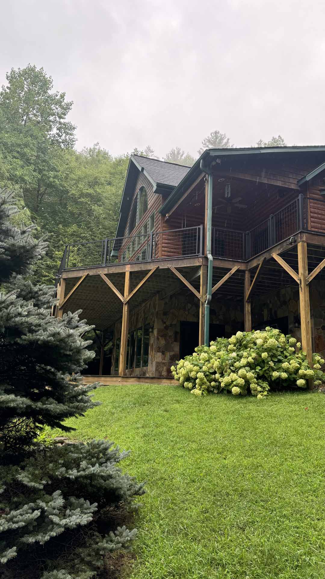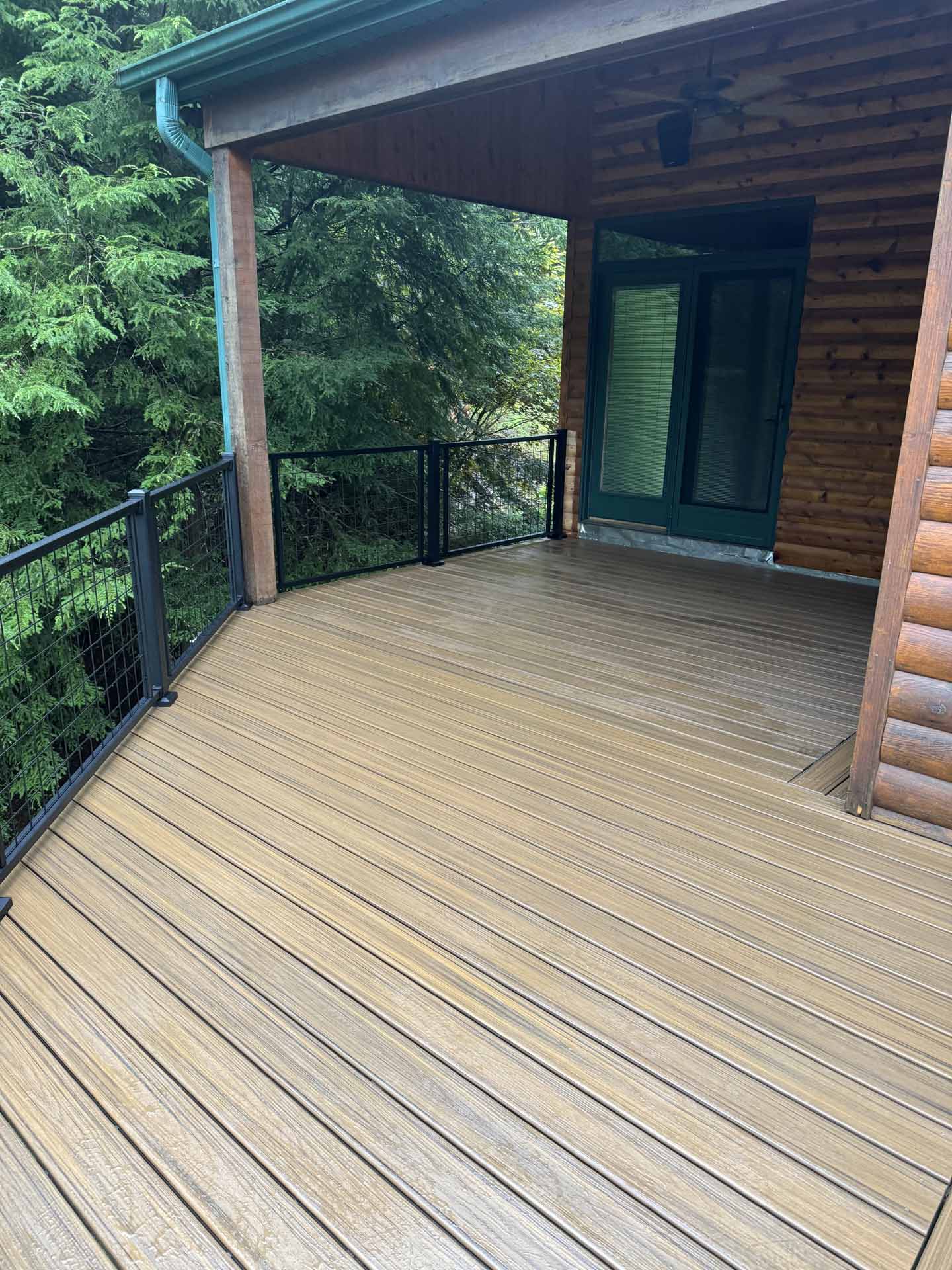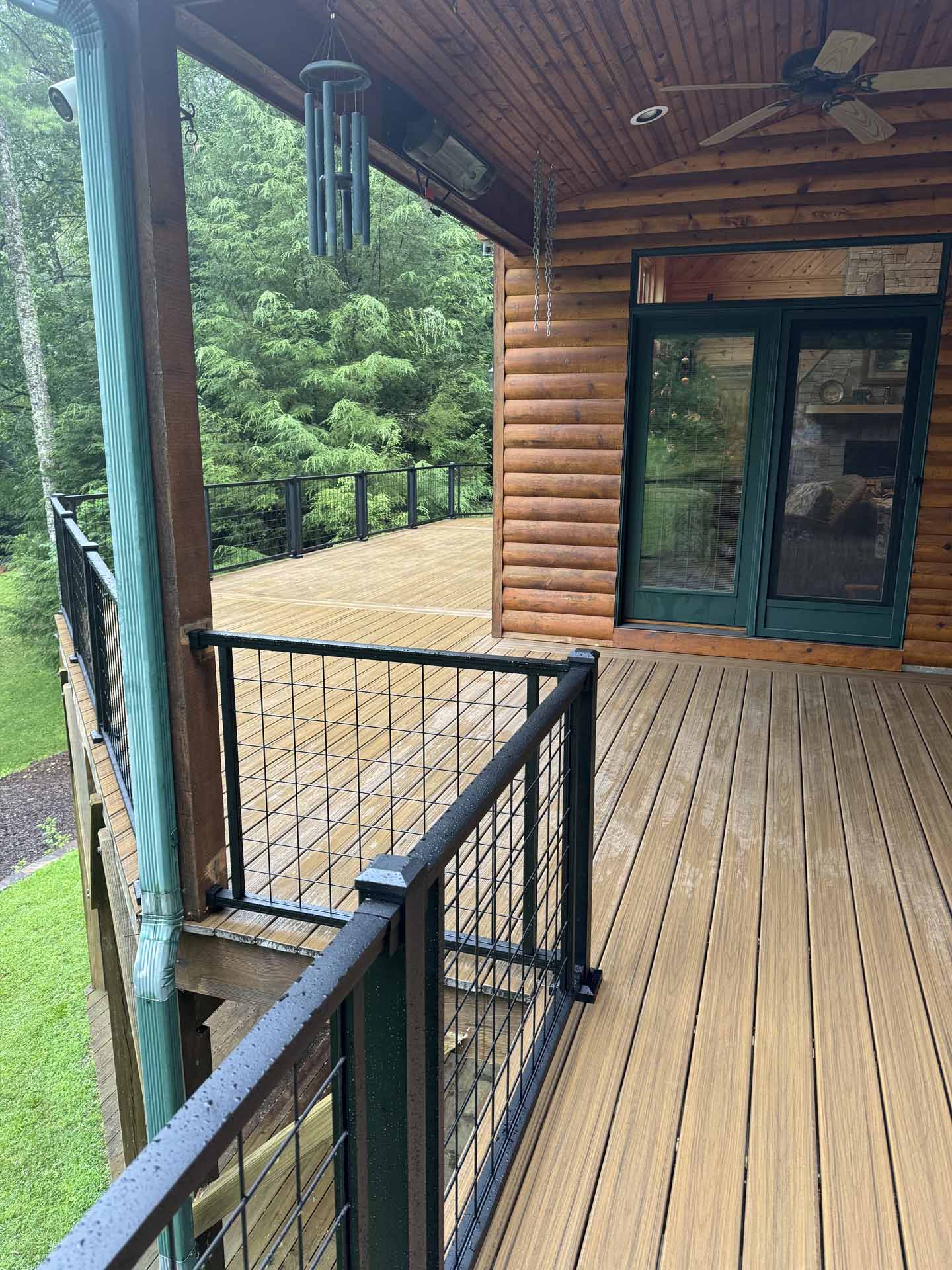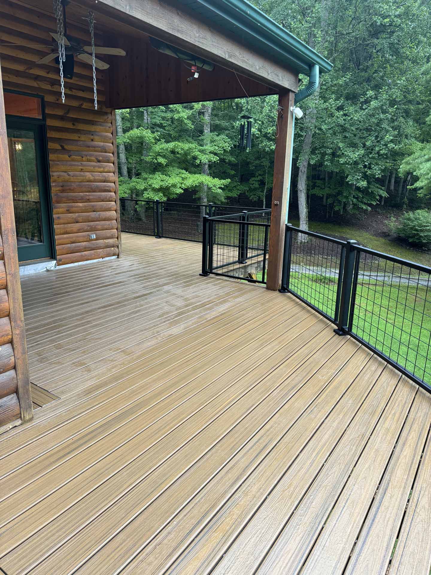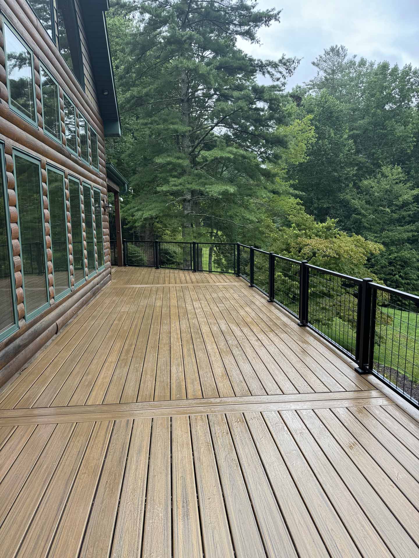 Perched in a serene mountain setting, this custom deck provides sweeping views of a mountain stream. Crafted with long-lasting Trex decking and a unique hogwire railing, it’s designed for both style and comfort—perfect for rocking chairs, quiet reflection, or entertaining in the outdoors.