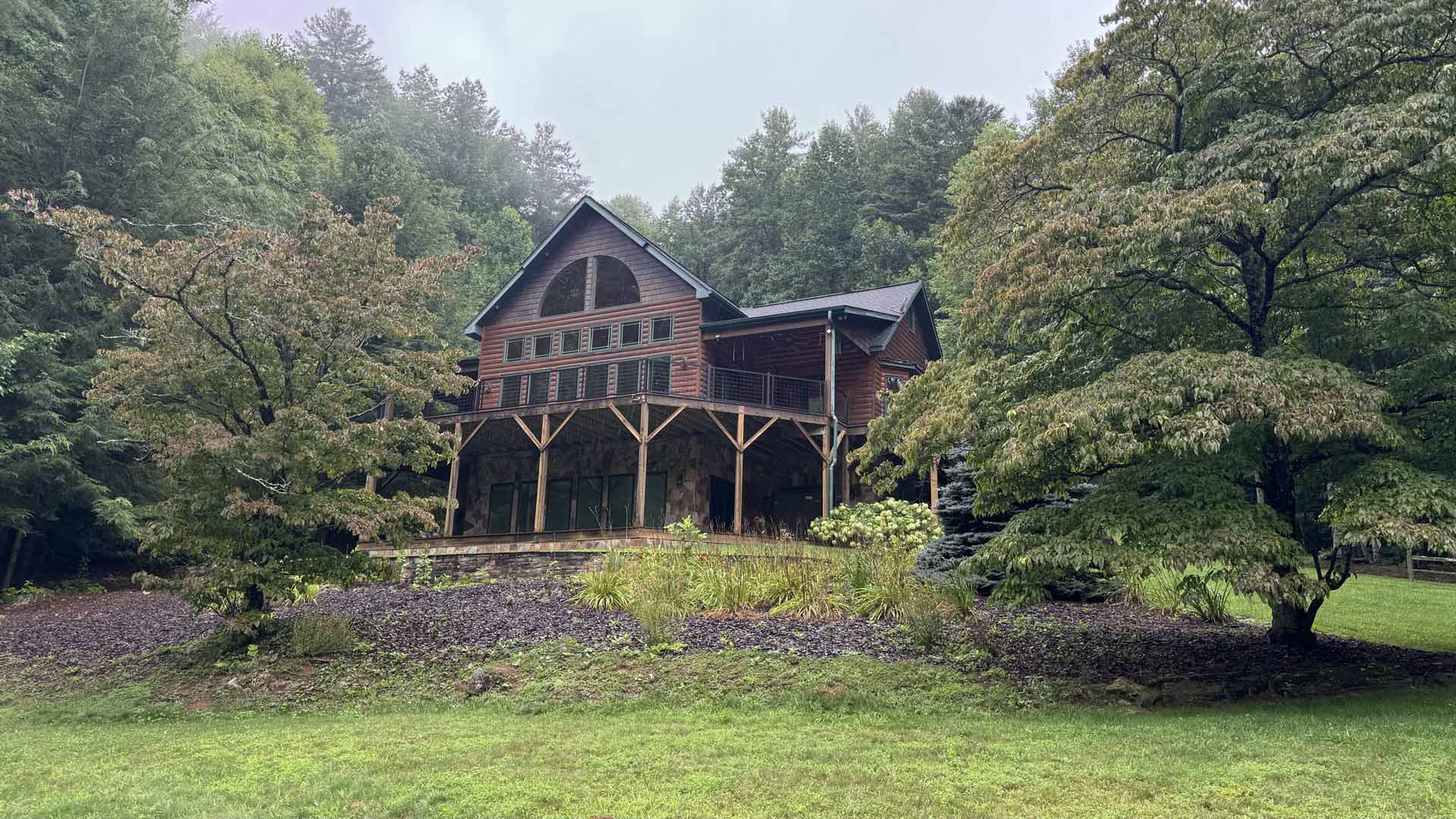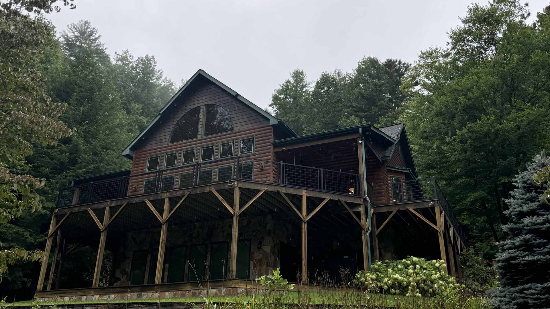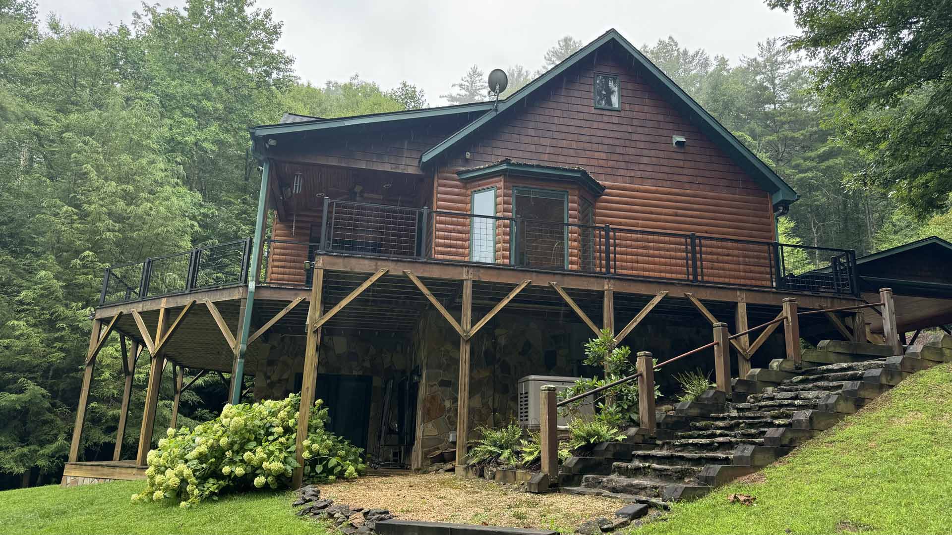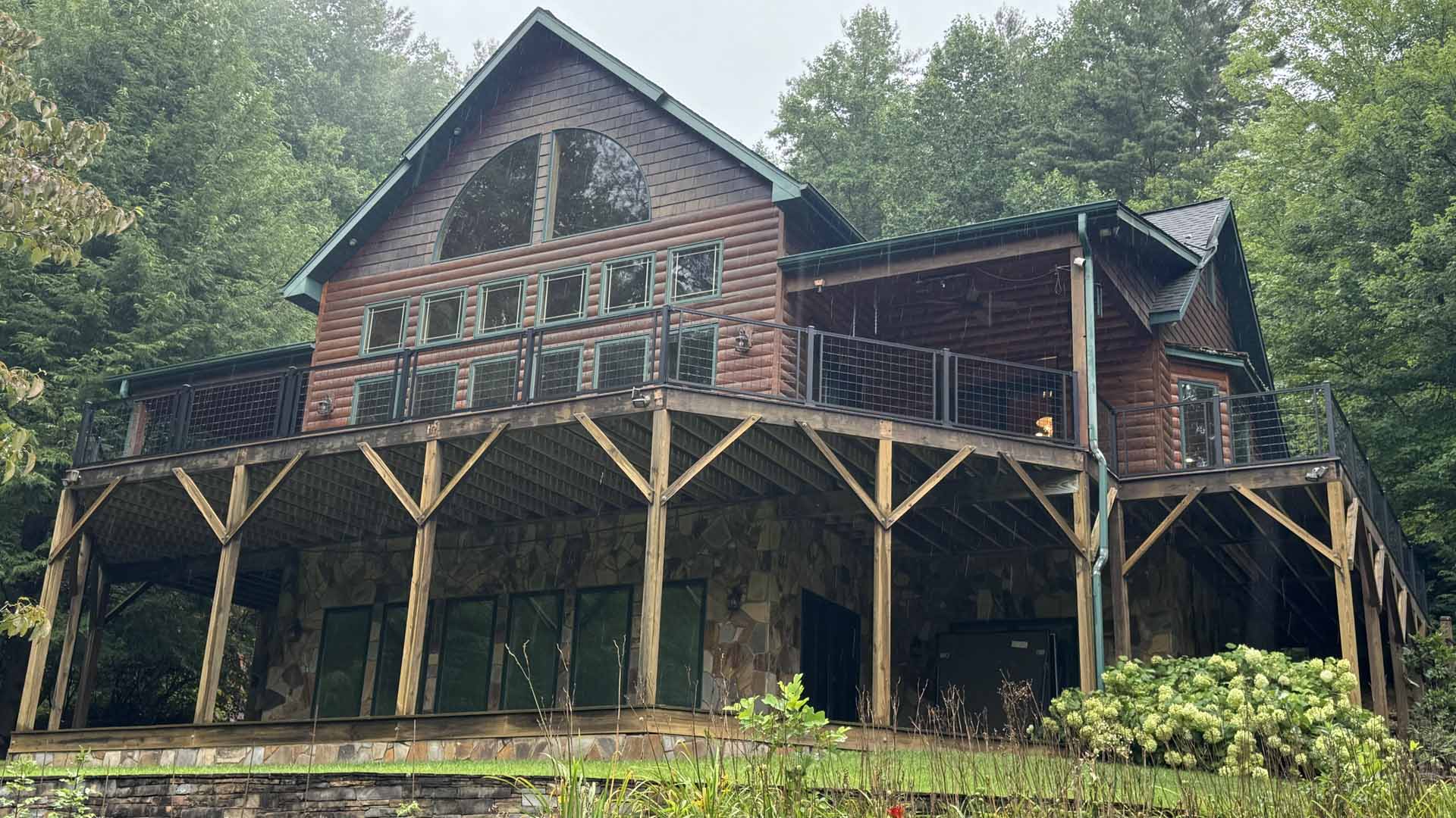Perched in a serene mountain setting, this custom deck provides sweeping views of a mountain stream. Crafted with long-lasting Trex decking and a unique hogwire railing, it’s designed for both style and comfort—perfect for rocking chairs, quiet reflection, or entertaining in the outdoors.
