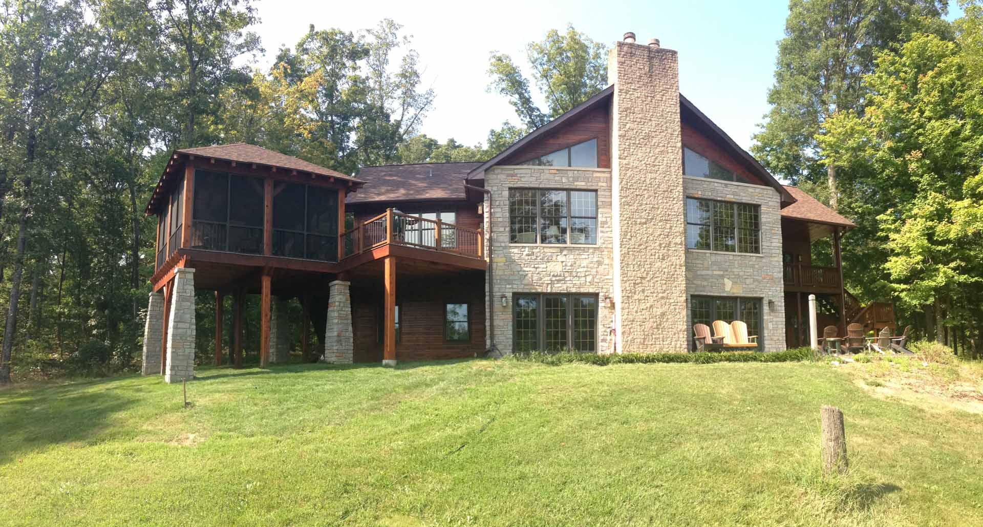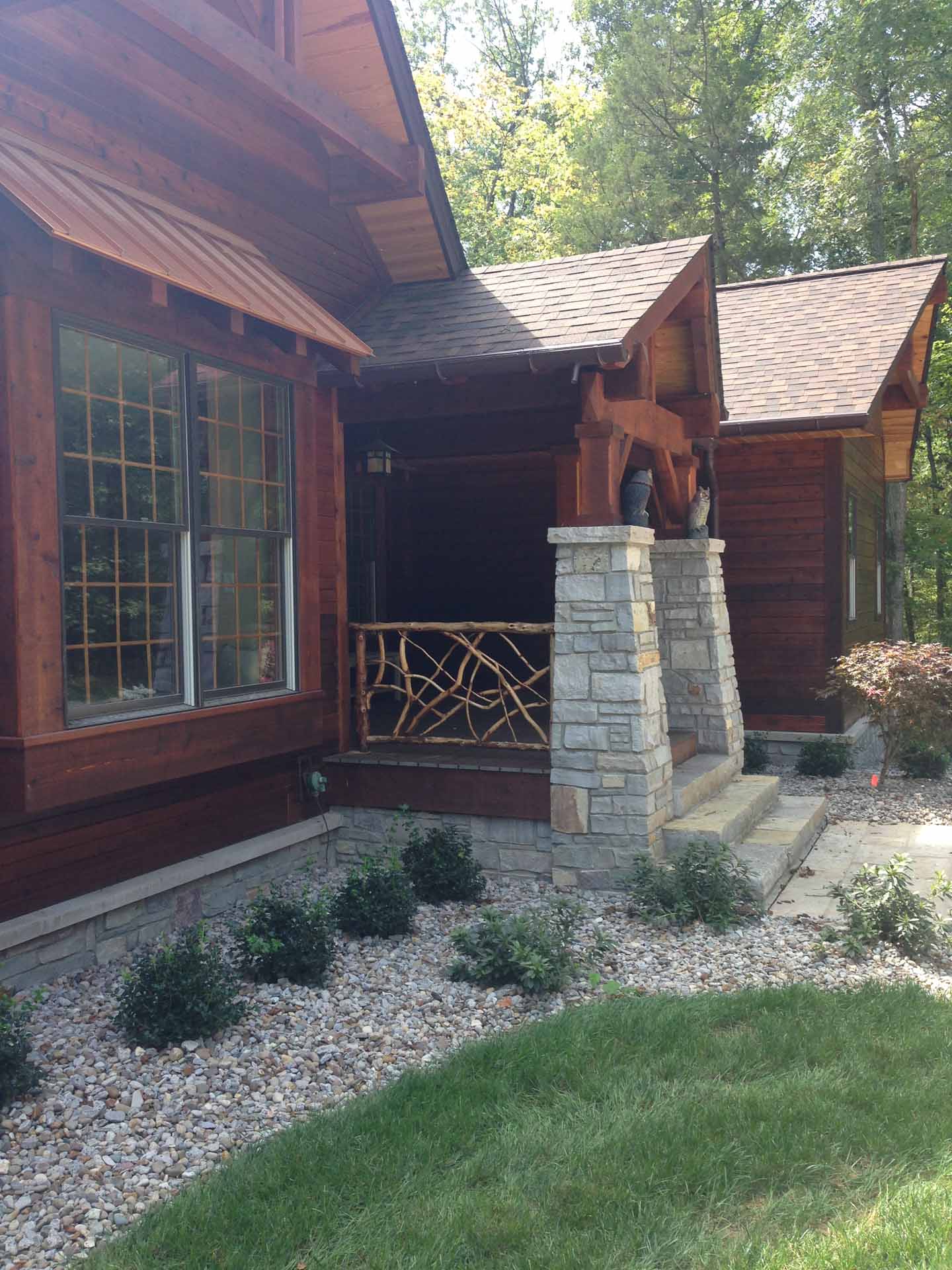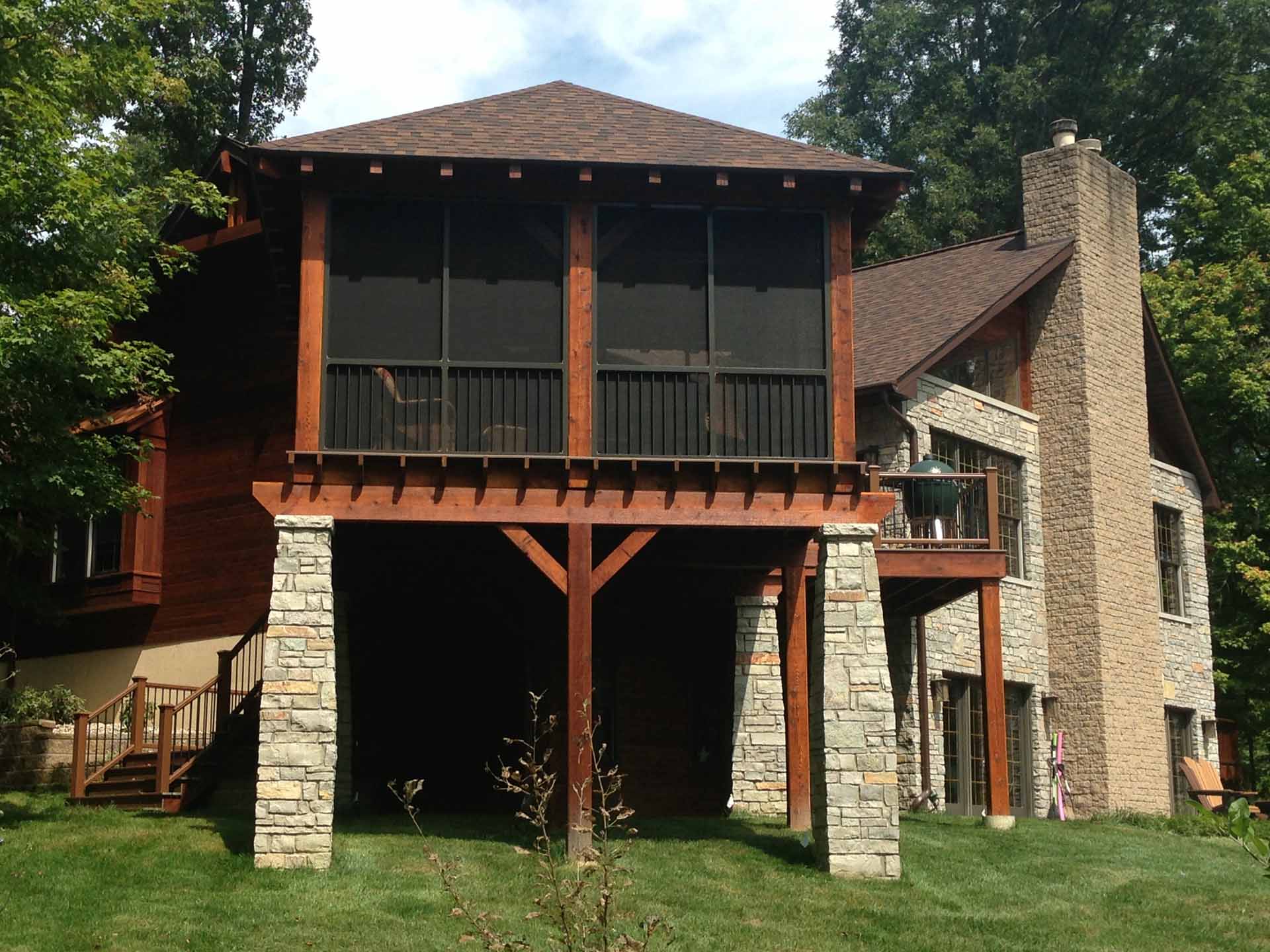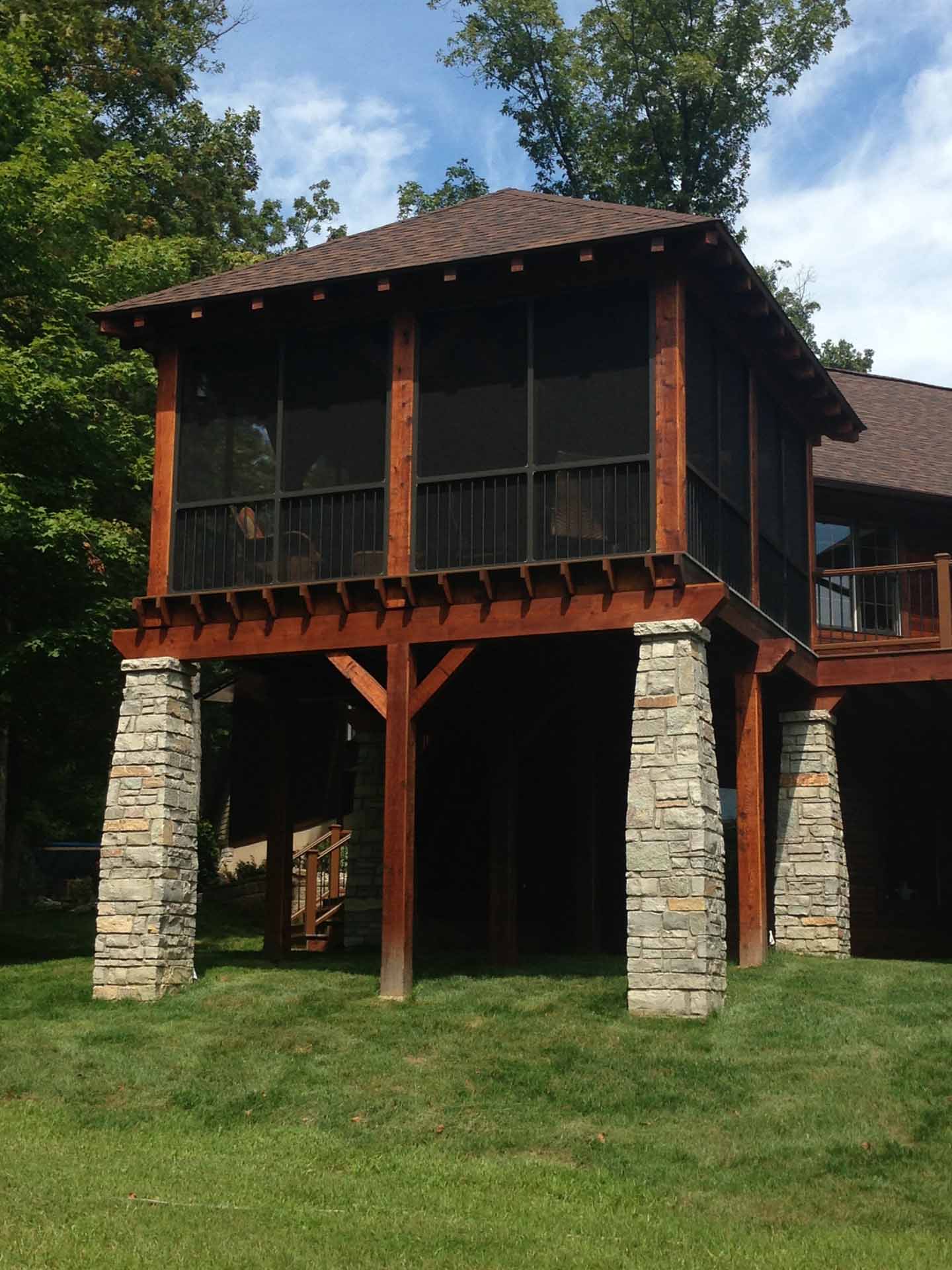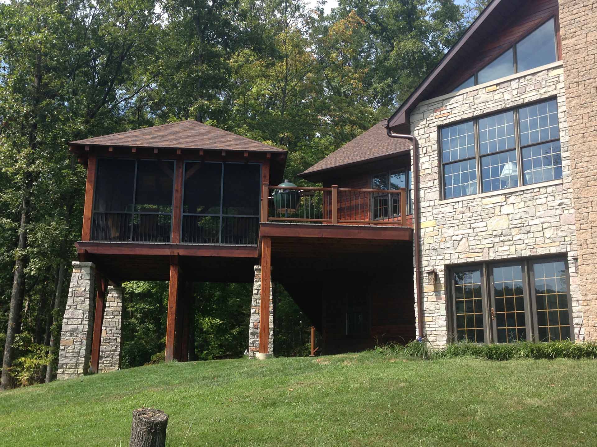 Nestled above the landscape in Henryville, Indiana, this elevated screened porch features stunning cedar beams and rich natural wood details atop substantial stone columns. A connecting walkway leads to the main living area, offering a graceful transition from indoor comfort to outdoor enjoyment with picturesque lake views.