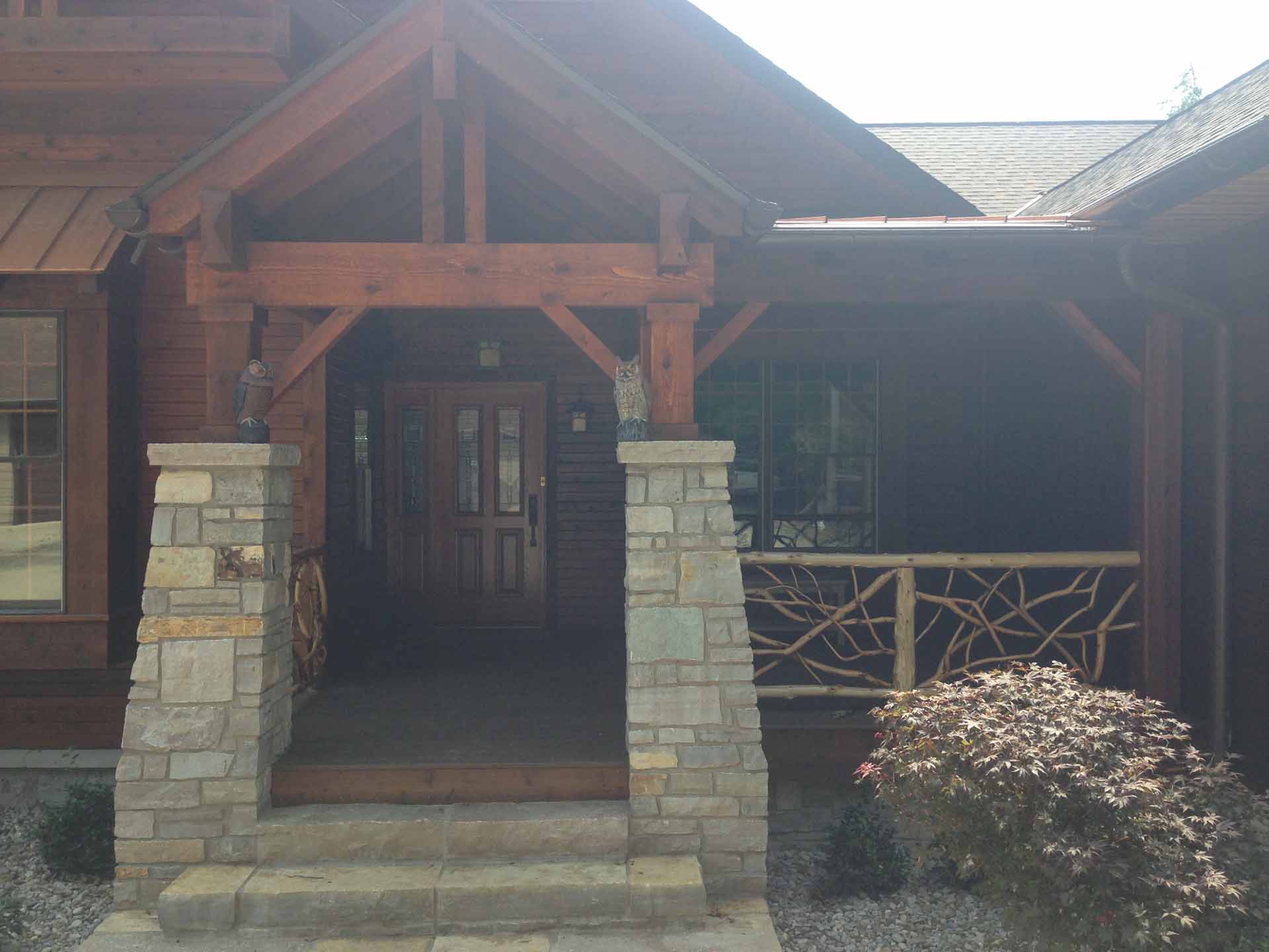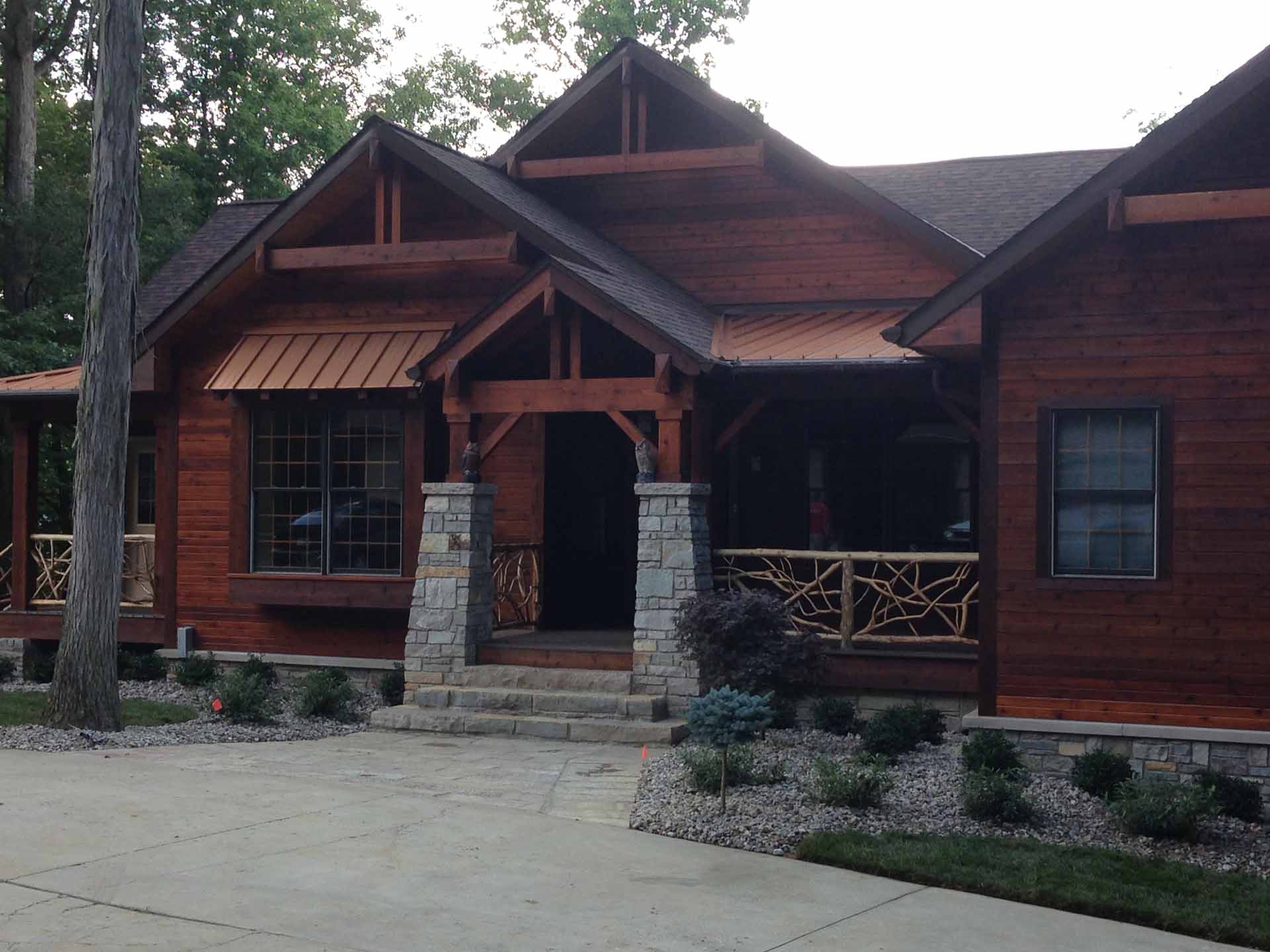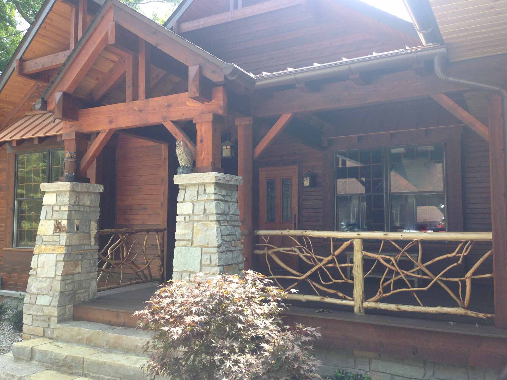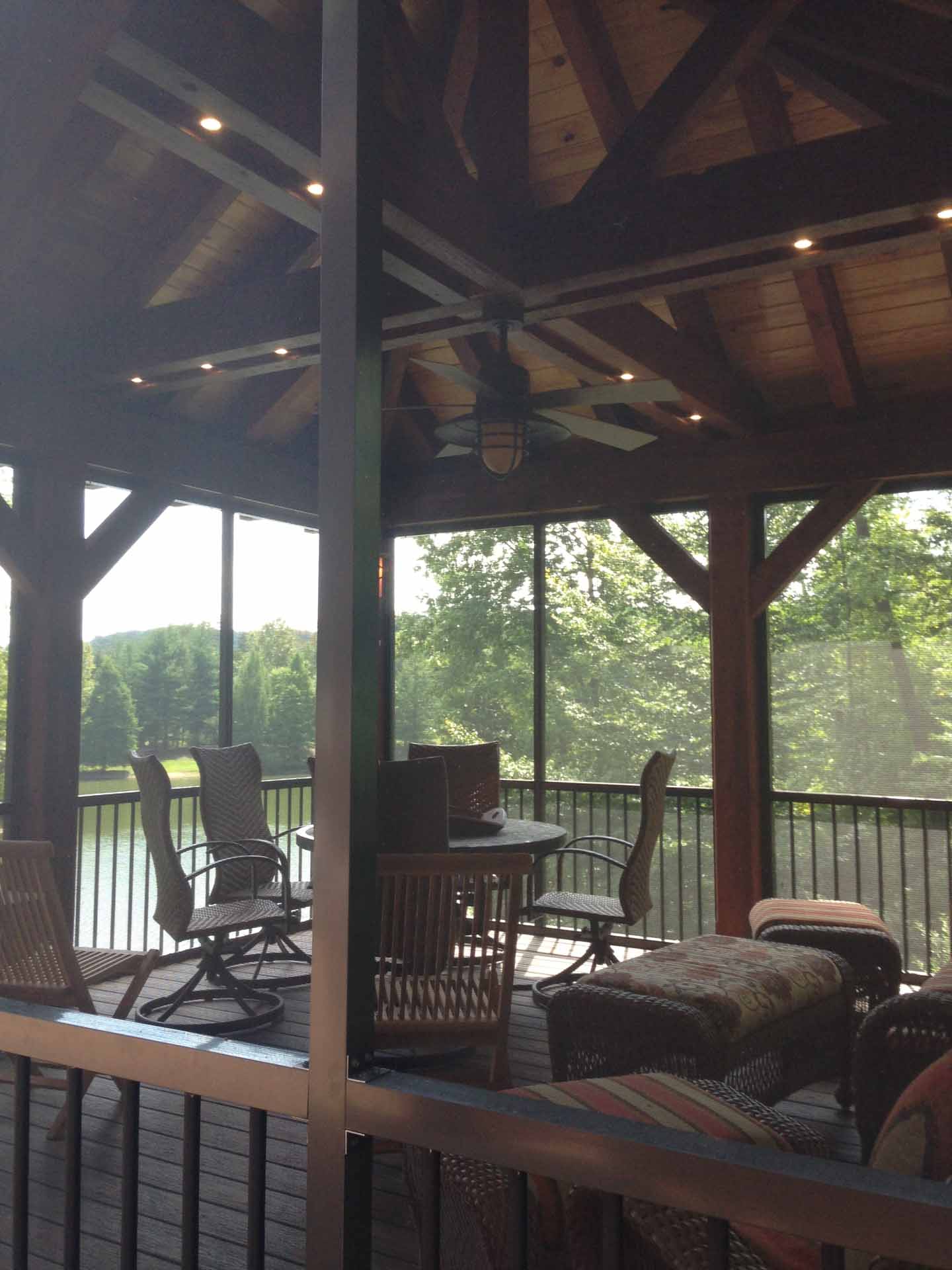 Nestled above the landscape in Henryville, Indiana, this elevated screened porch features stunning cedar beams and rich natural wood details atop substantial stone columns. A connecting walkway leads to the main living area, offering a graceful transition from indoor comfort to outdoor enjoyment with picturesque lake views.