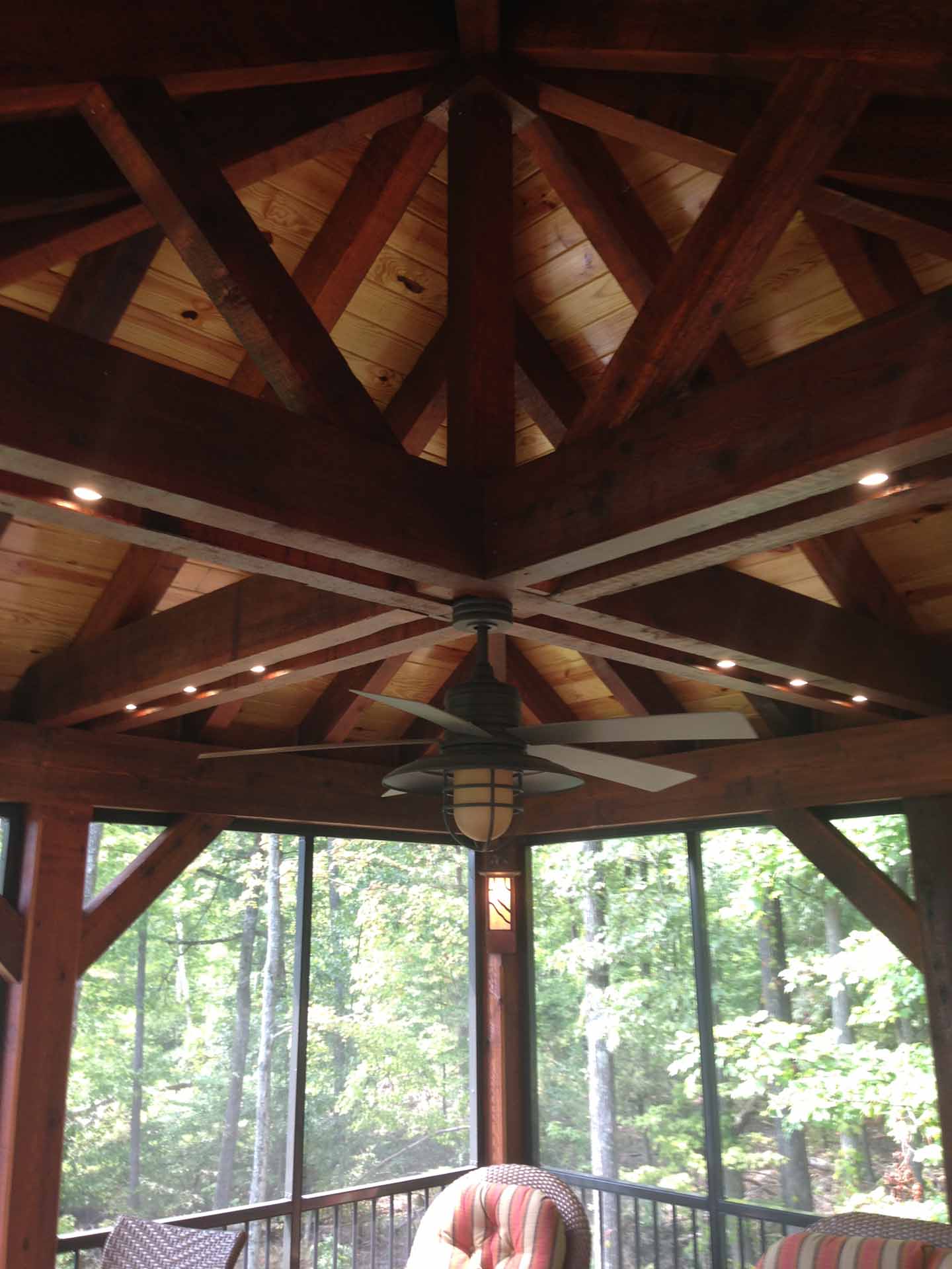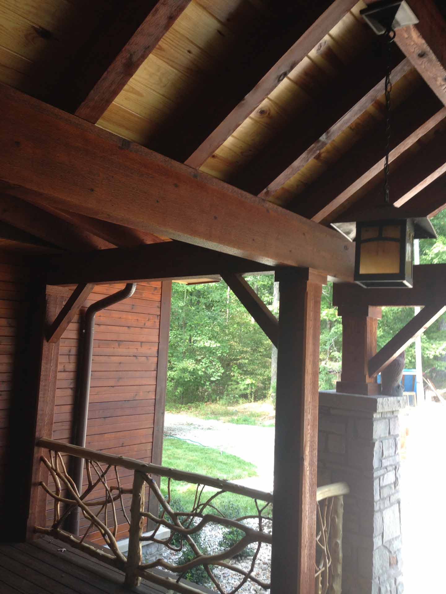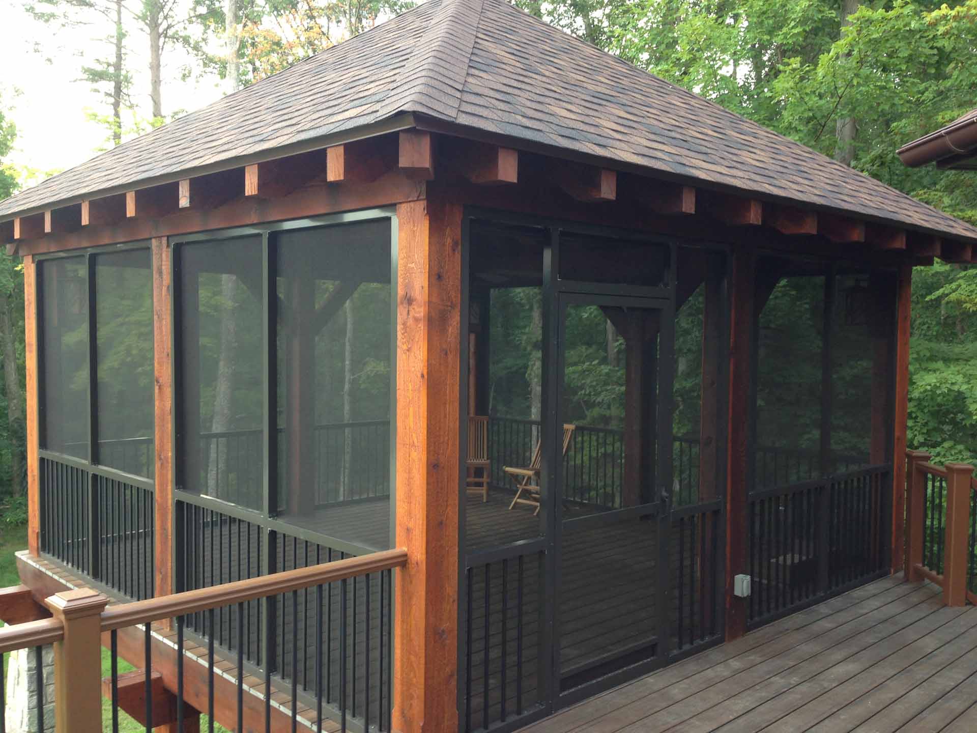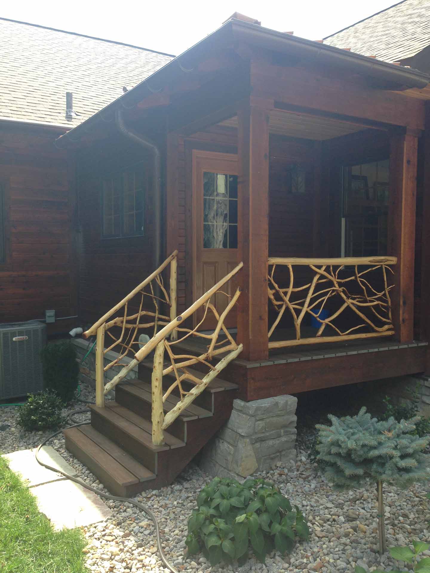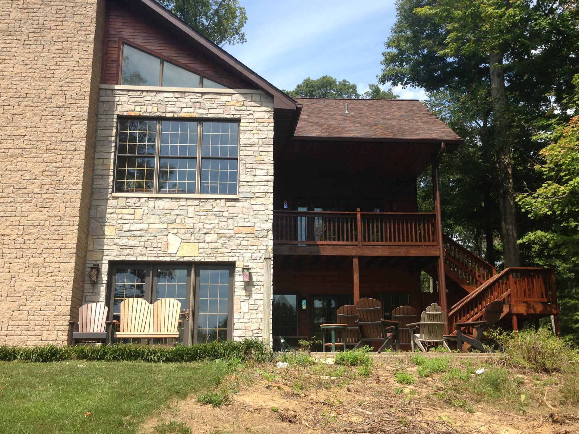 Nestled above the landscape in Henryville, Indiana, this elevated screened porch features stunning cedar beams and rich natural wood details atop substantial stone columns. A connecting walkway leads to the main living area, offering a graceful transition from indoor comfort to outdoor enjoyment with picturesque lake views.