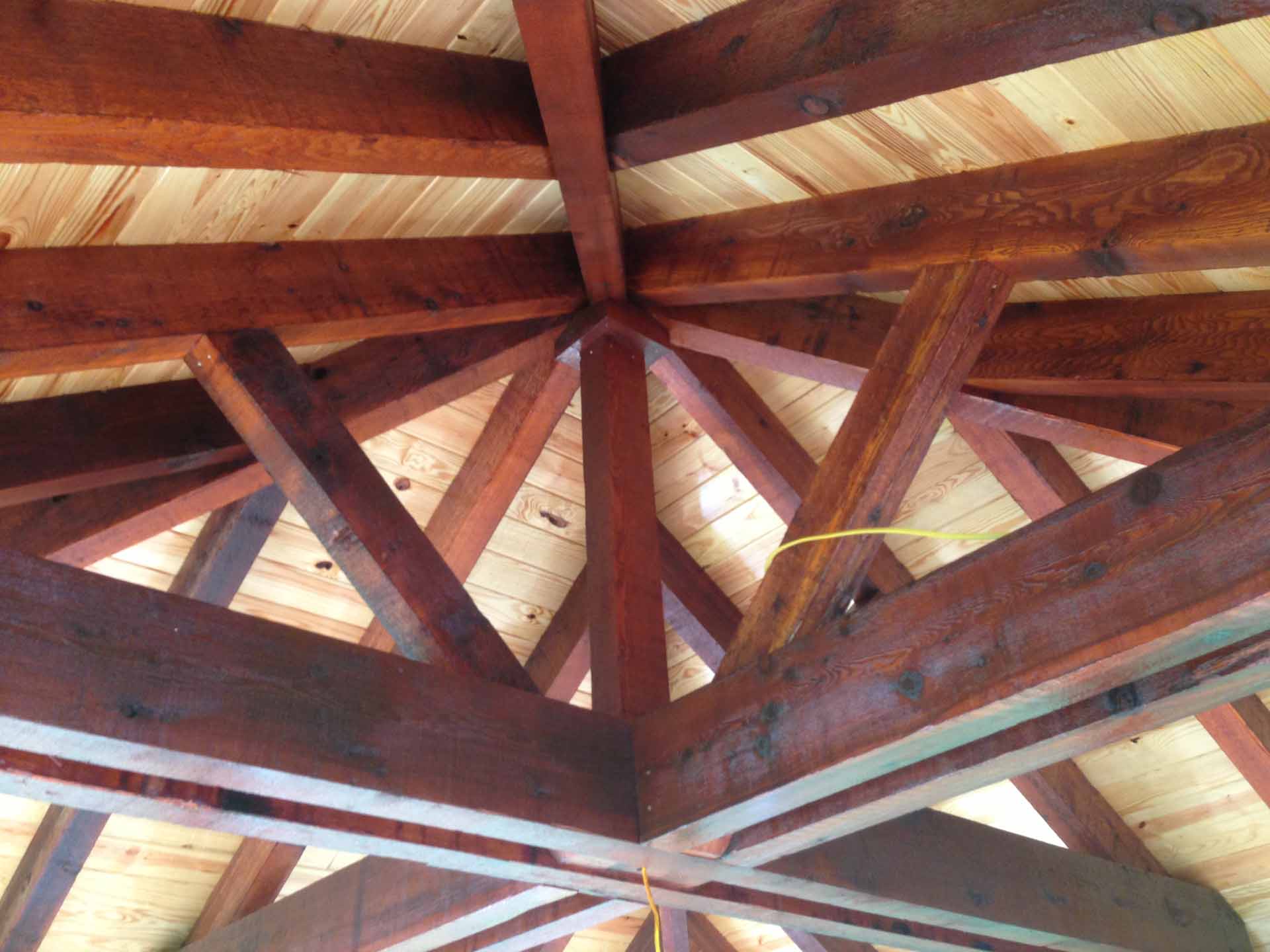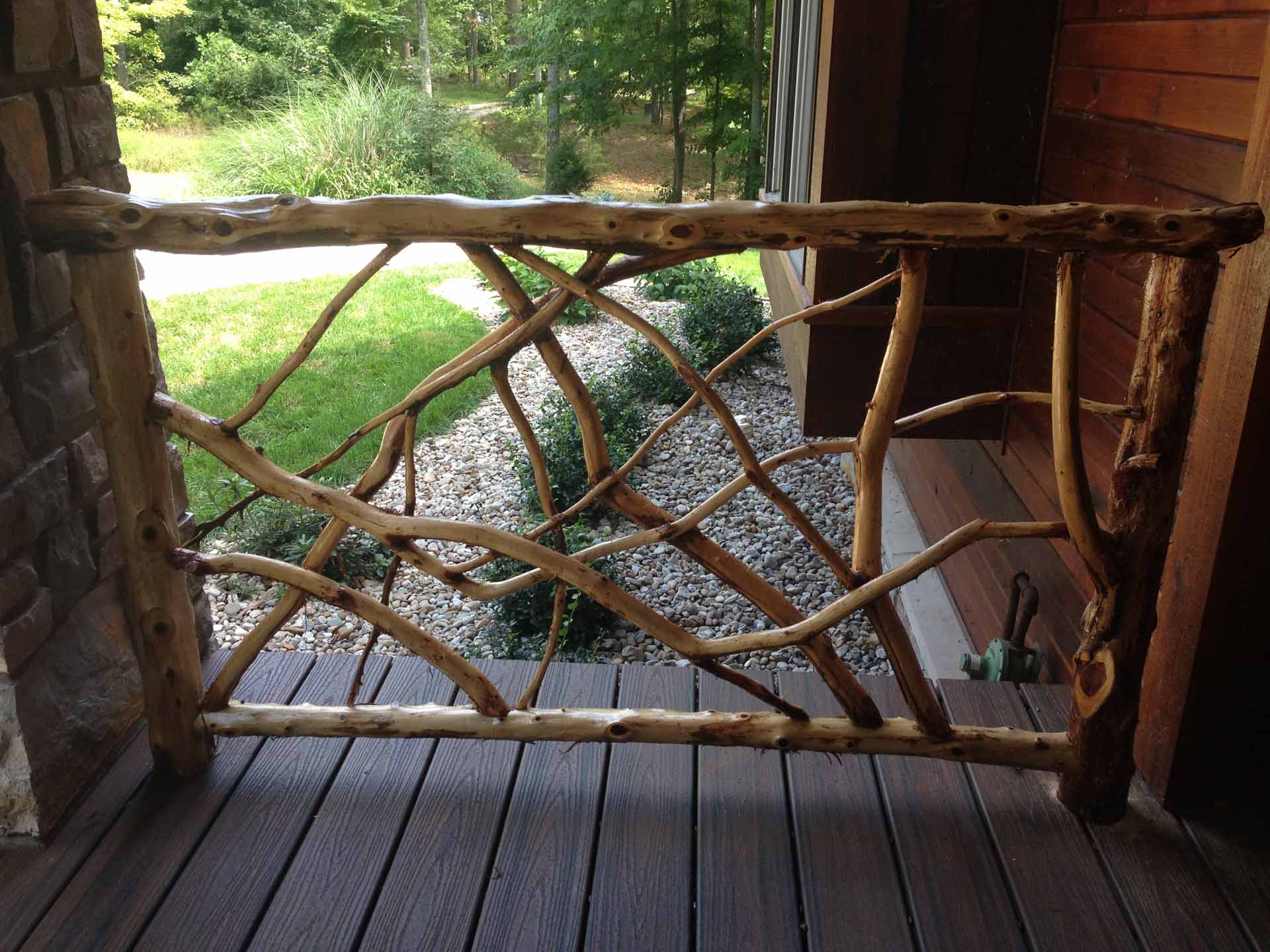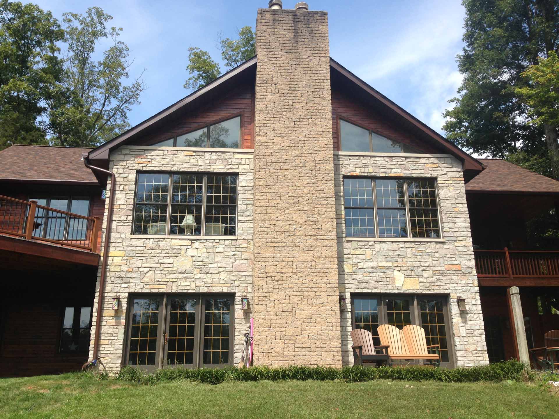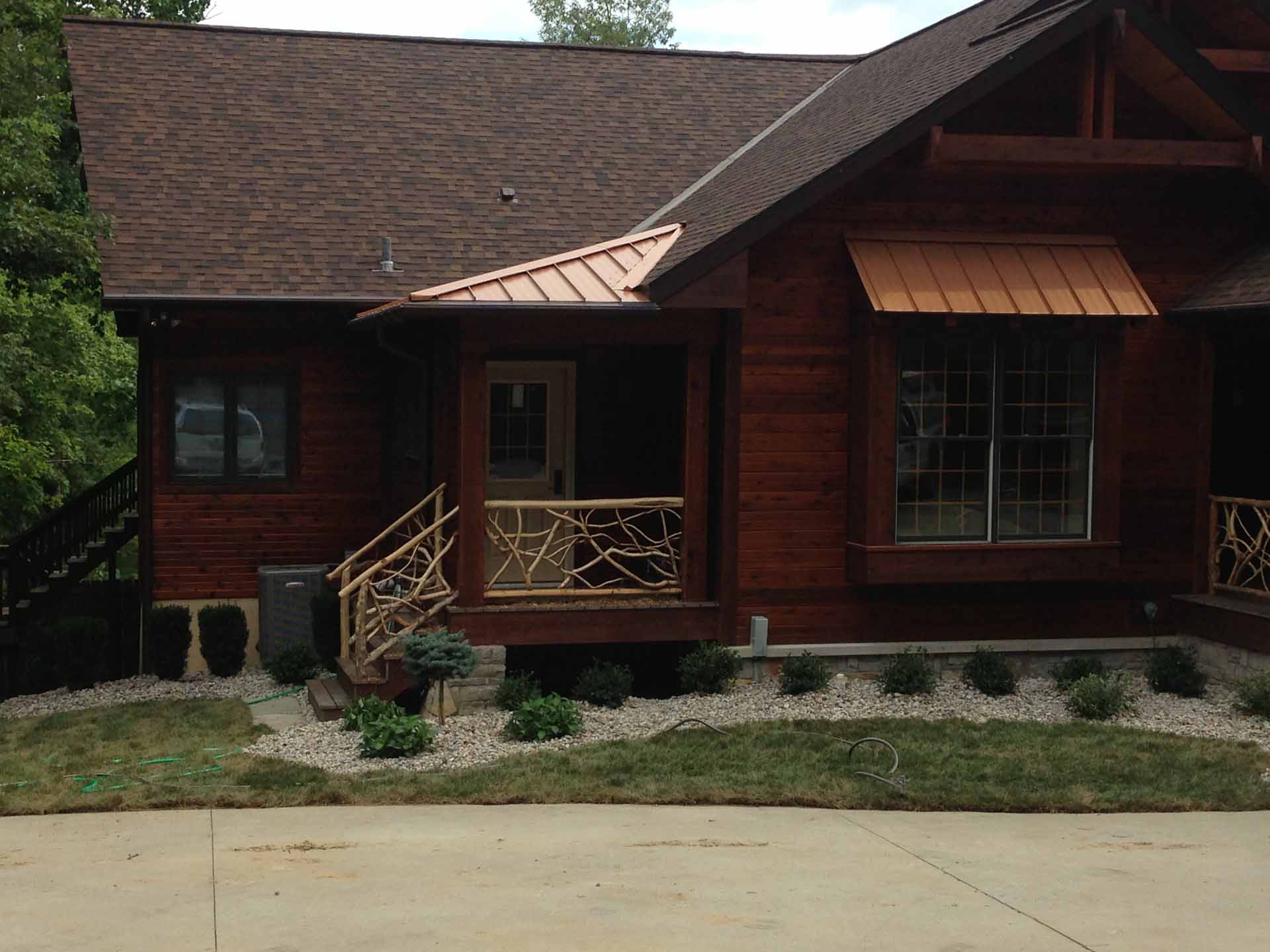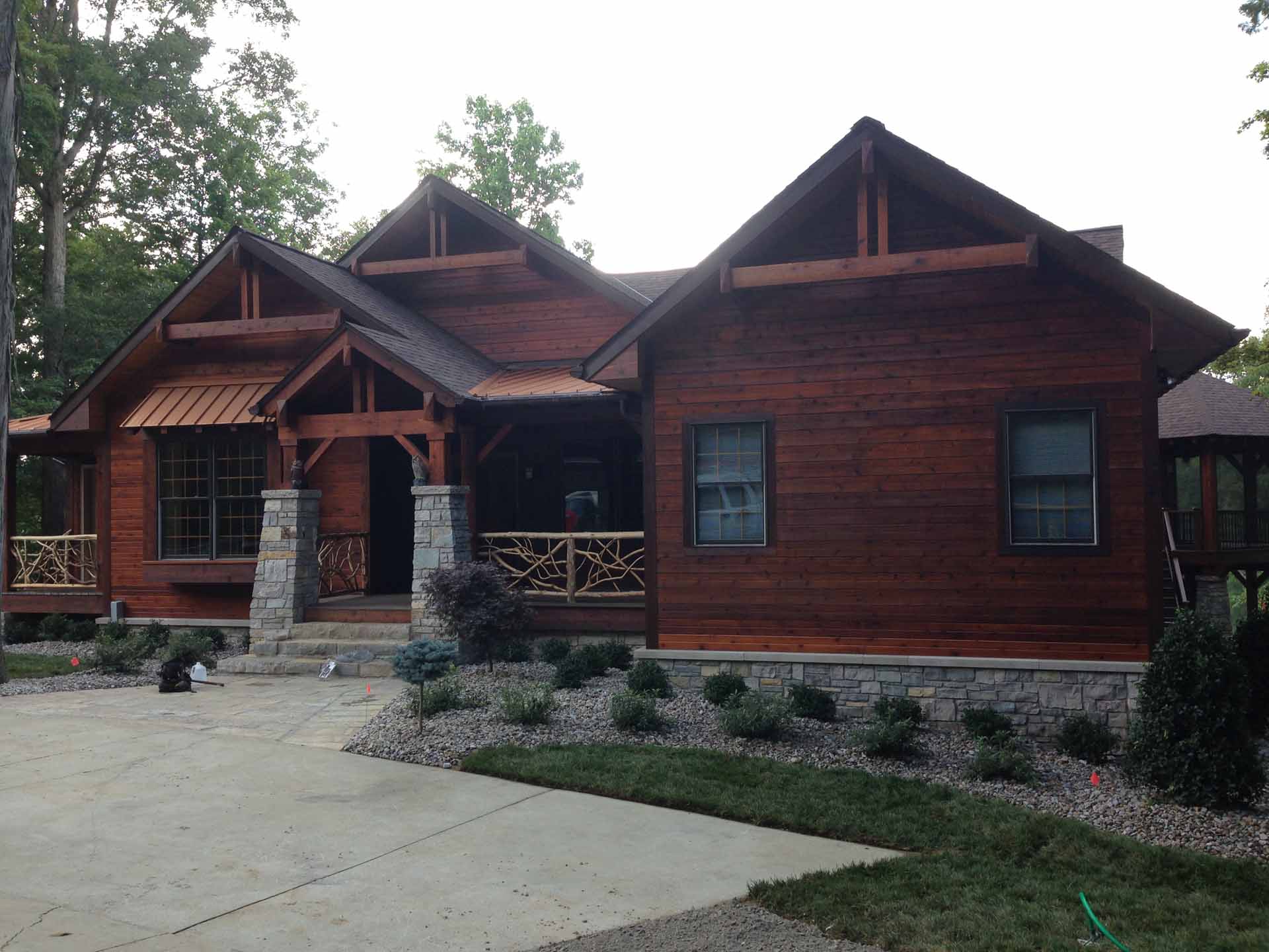 Nestled above the landscape in Henryville, Indiana, this elevated screened porch features stunning cedar beams and rich natural wood details atop substantial stone columns. A connecting walkway leads to the main living area, offering a graceful transition from indoor comfort to outdoor enjoyment with picturesque lake views.